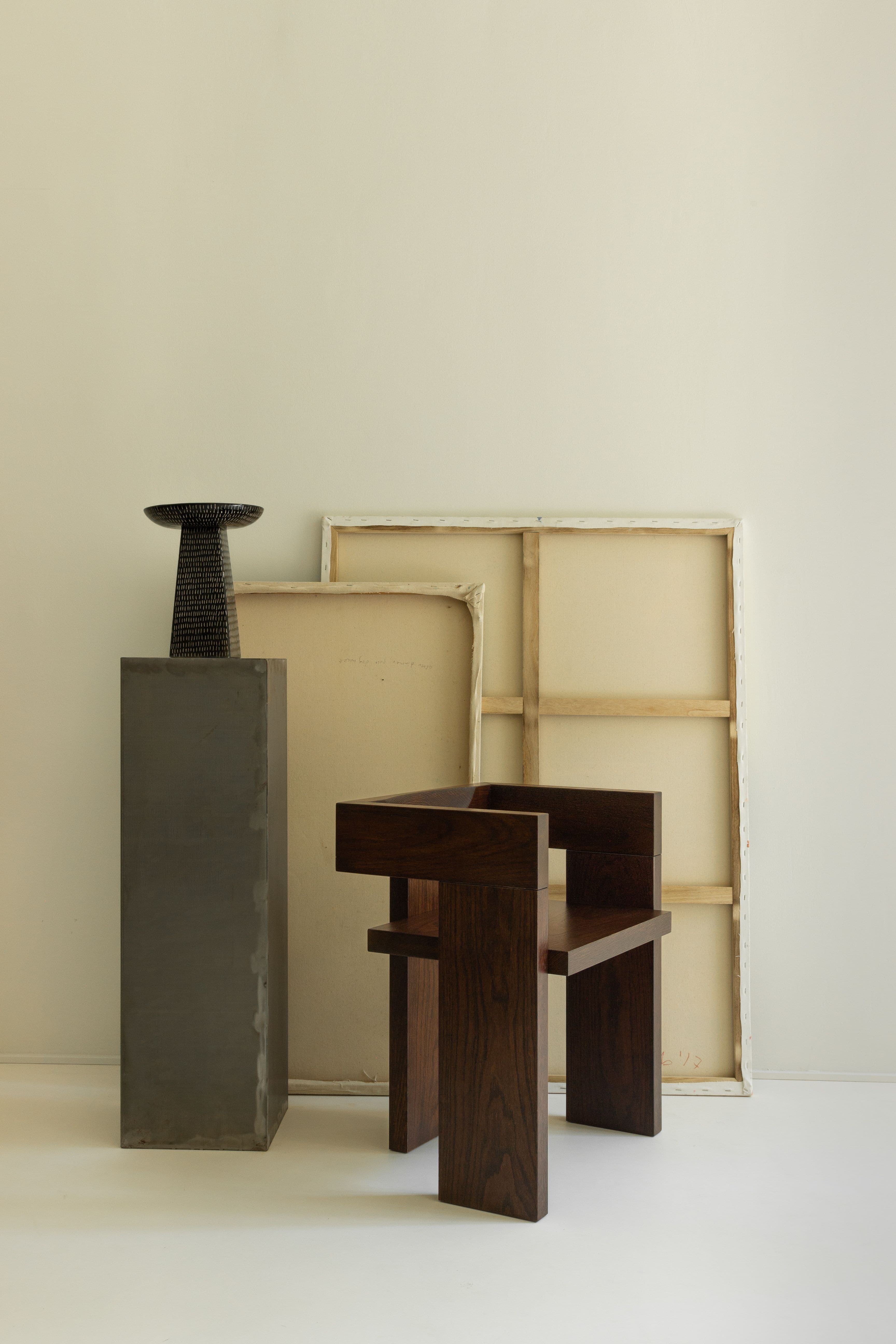 Ert is a wooden chair composed of seven boards. A slender band encompasses the square seat. Supported by a central post, the band twists from the legs to the low, half-moon carved backrest. In the spirit of Dutch Neoplasticism, ert is a tribute to graphic simplicity.