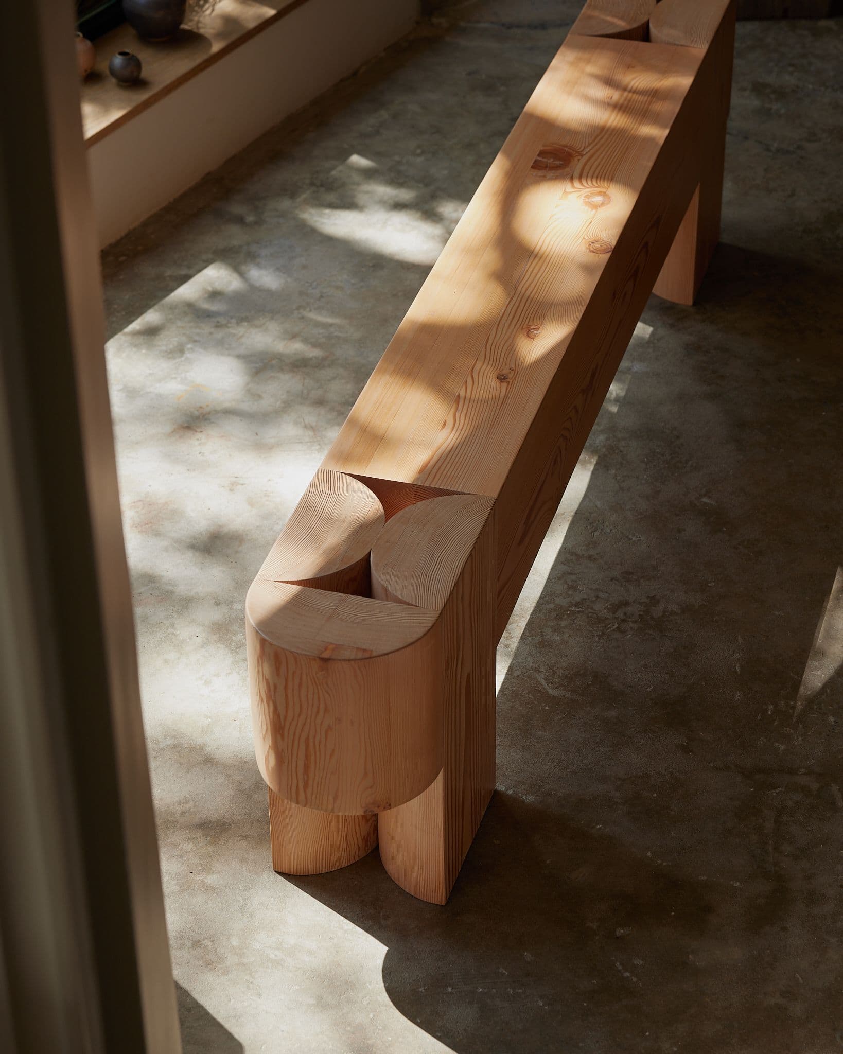 The Arc table and bench embody Goodrum's love for pure geometry, reconfiguring a half circle into a new form, balancing positive and negative elements with unconventional proportions. Crafted from recycled solid Oregon timber, the end grain exposes the tree's age through its rings, telling a story of seasons past.