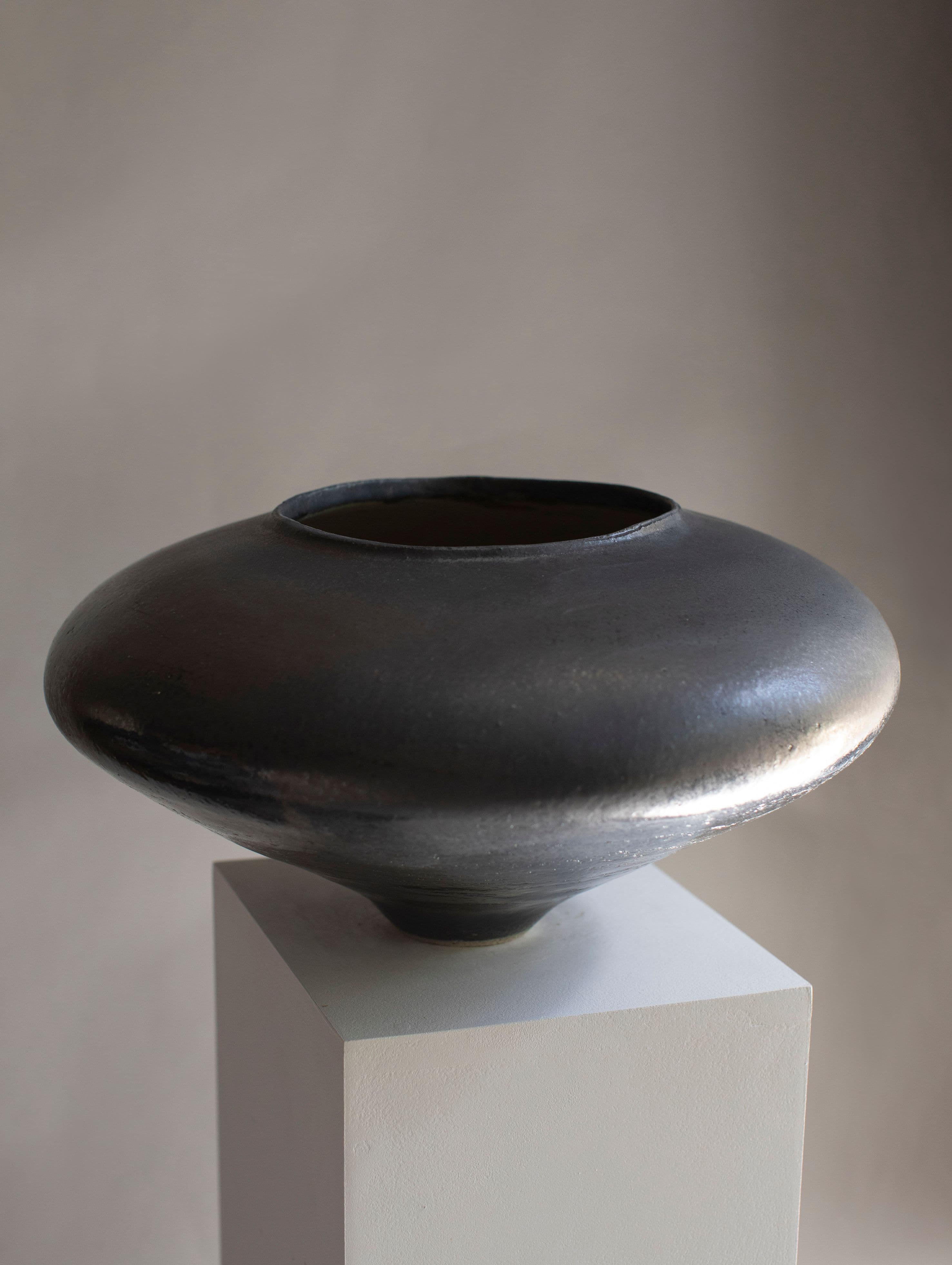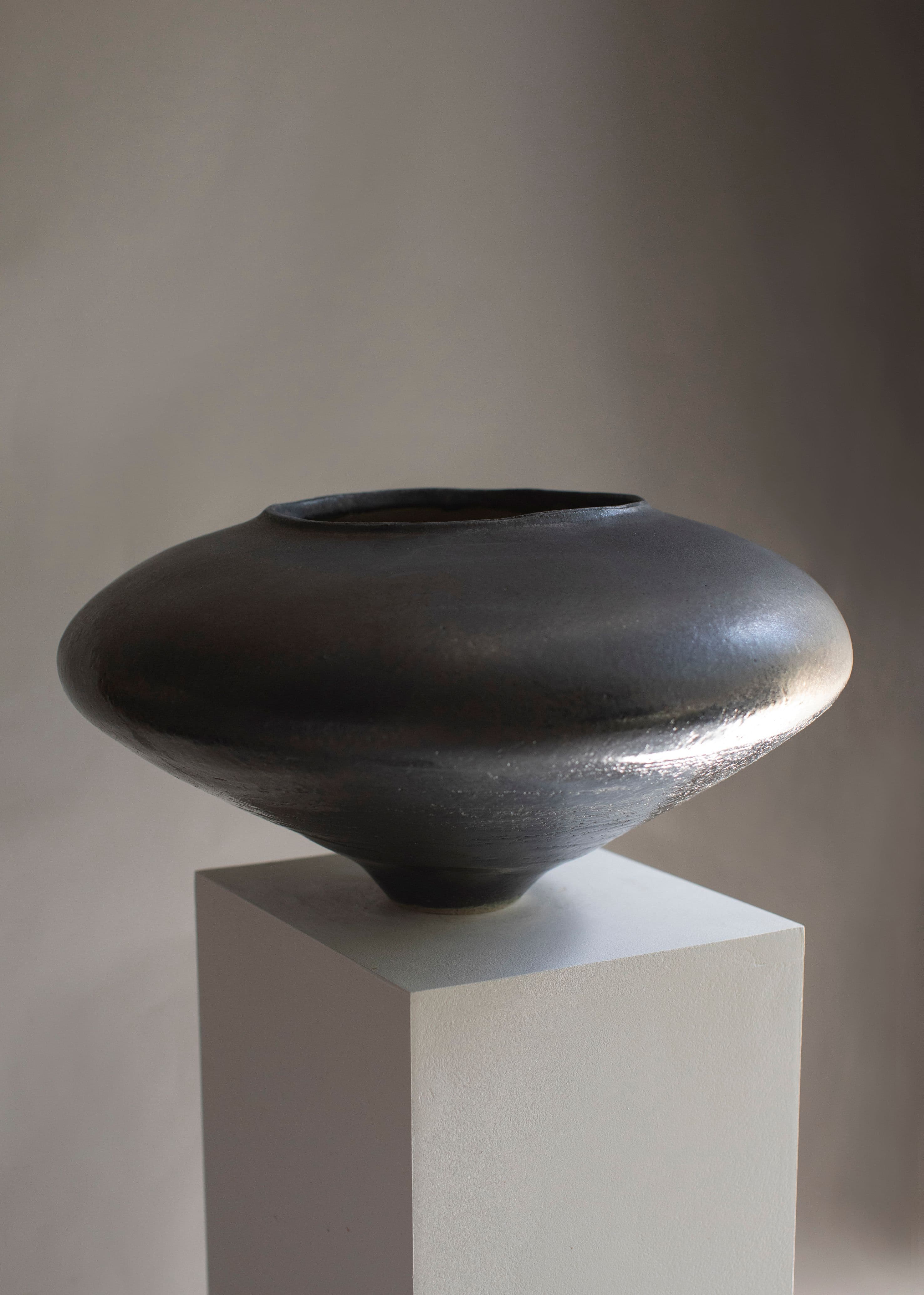 Hand built, high fired stoneware, black matte glaze with breaking through glossy parts on underside