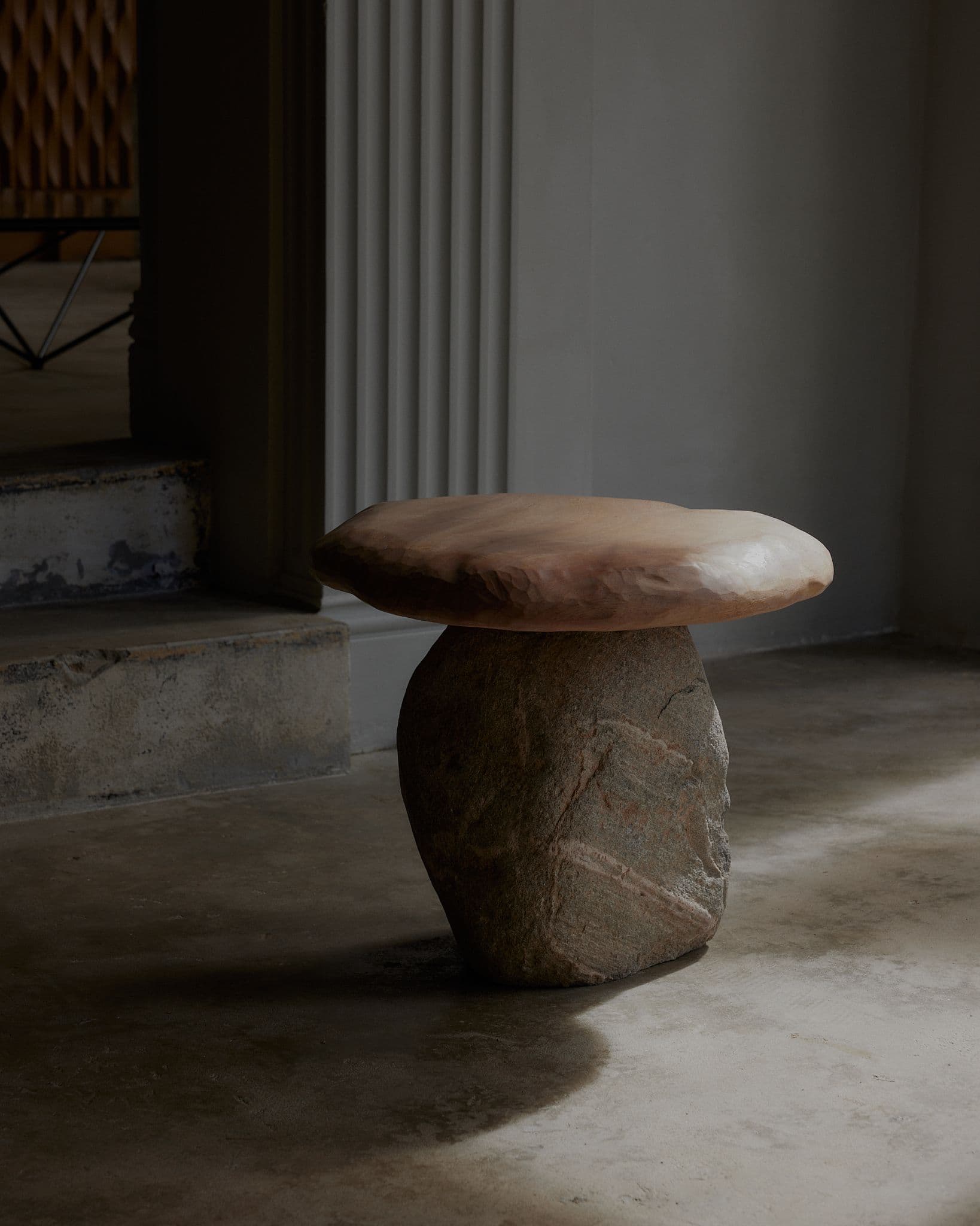 A collaboration between Batten and Kamp and sculptor/architect Henry D’ath. Natural shapes and imperfections of the wood are subtly exaggerated through slow, intuitive hand carving. A dialogue of irregularities between wood and stone.