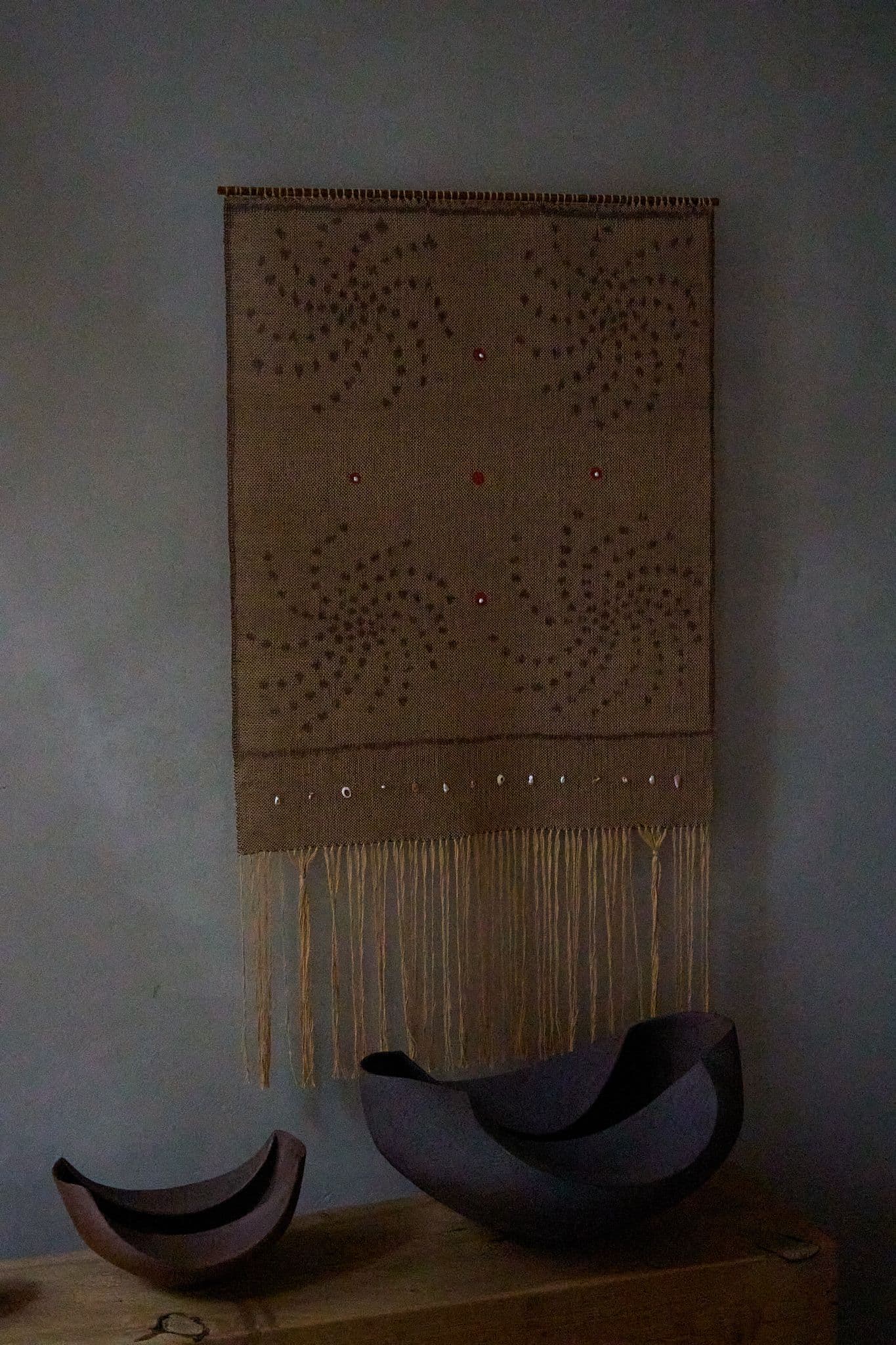 Through cotton, paint, and pearls, Wae builds an altar-like surface that holds both fragility and reverence. Each material carries its own symbolism: cotton as a grounding fibre, paint as gesture and trace, pearls as offerings from the sea. Together, they create a field where the personal and ancestral intertwine, honouring what is passed down and what is remade in the present moment.