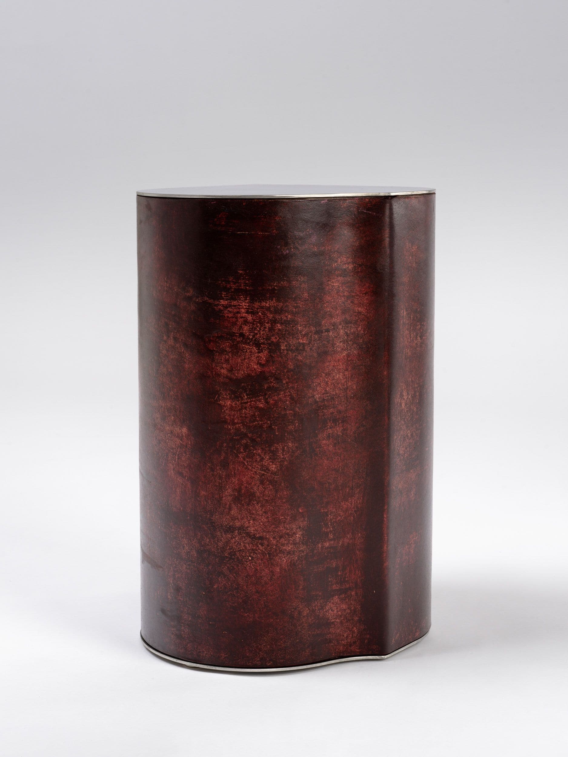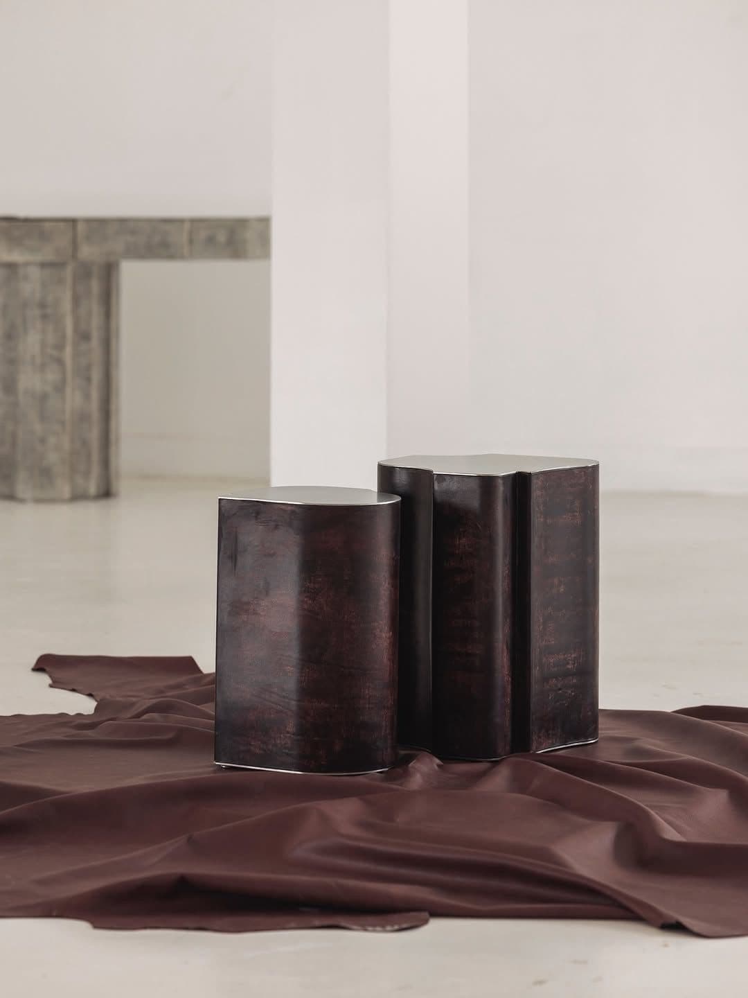 The Fragment Collection is a series of sculptural furniture pieces characterised by their irregular and asymmetrical shapes with classical influences. These unique pieces predominantly feature vegetable-tanned leather, a material that serves as an ideal canvas due to its porosity and natural blemishes. In creating the textures for this collection, various artisanal techniques are employed. The leather canvas is meticulously scraped, manipulated, and infused with natural pigments to achieve a distinctive, tactile surface. This hands-on approach allows each piece to embody a raw and organic aesthetic, highlighting the inherent beauty of the leather.