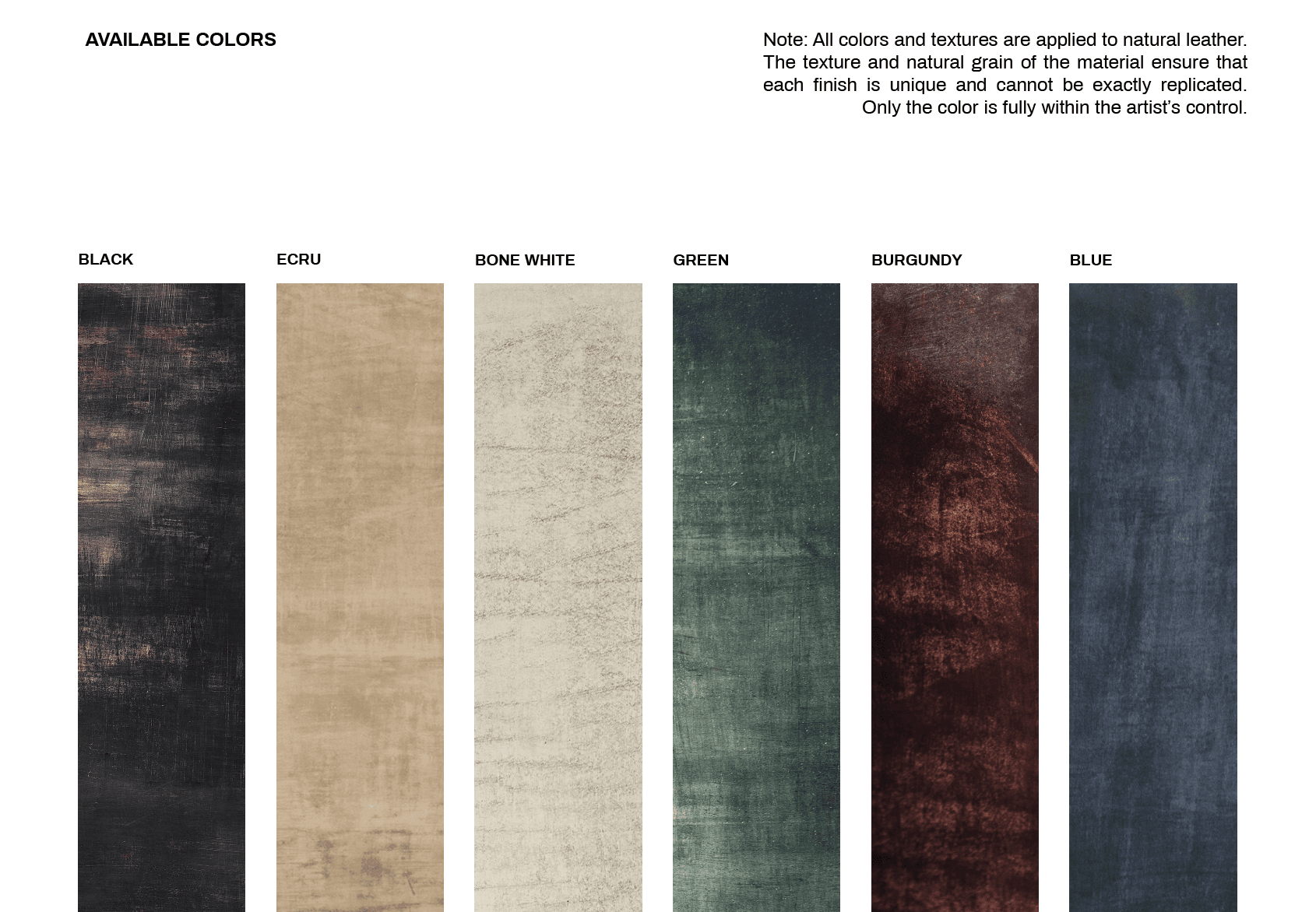 The Fragment Collection is a series of sculptural furniture pieces characterised by their irregular and asymmetrical shapes with classical influences. These unique pieces predominantly feature vegetable-tanned leather, a material that serves as an ideal canvas due to its porosity and natural blemishes. In creating the textures for this collection, various artisanal techniques are employed. The leather canvas is meticulously scraped, manipulated, and infused with natural pigments to achieve a distinctive, tactile surface. This hands-on approach allows each piece to embody a raw and organic aesthetic, highlighting the inherent beauty of the leather.