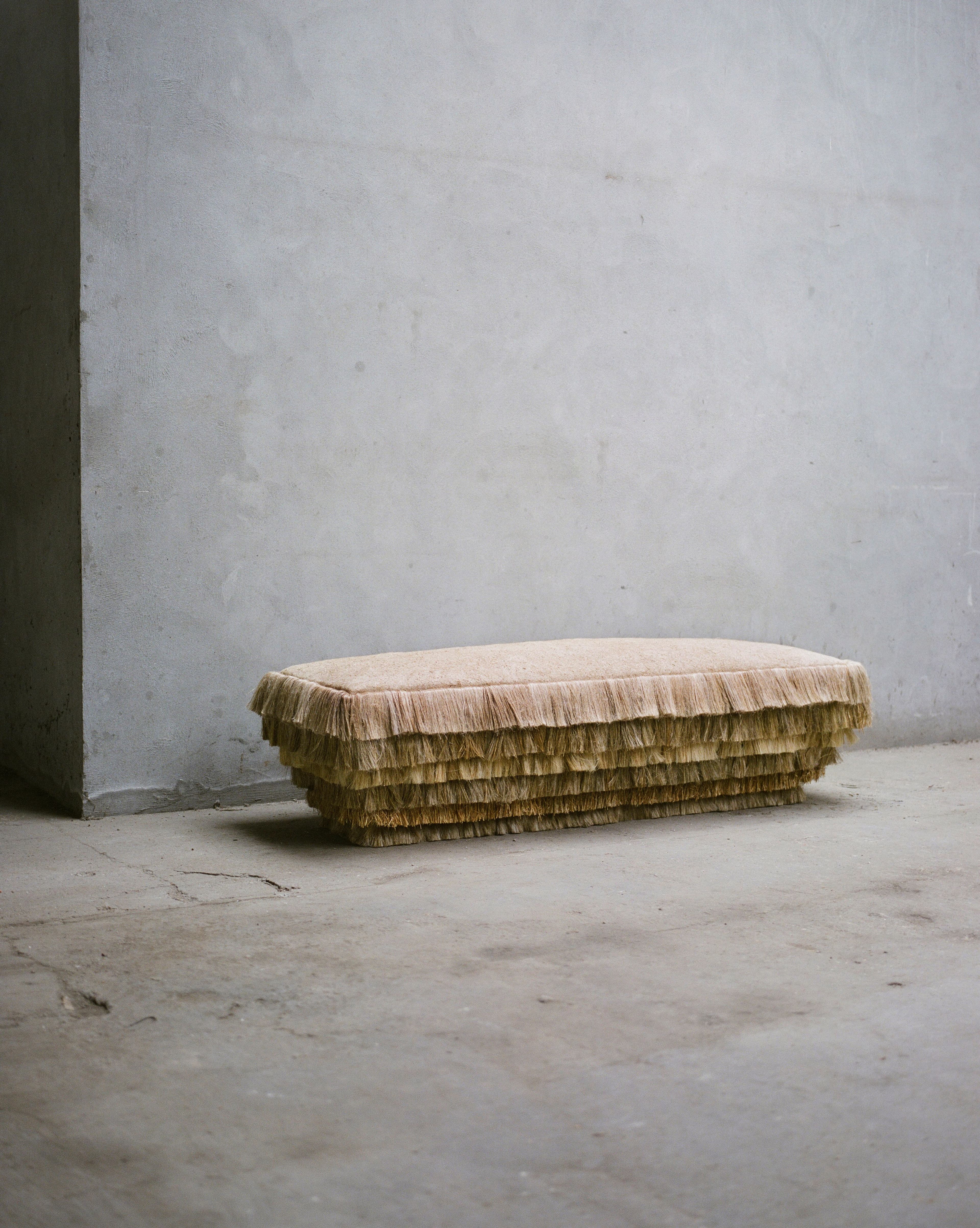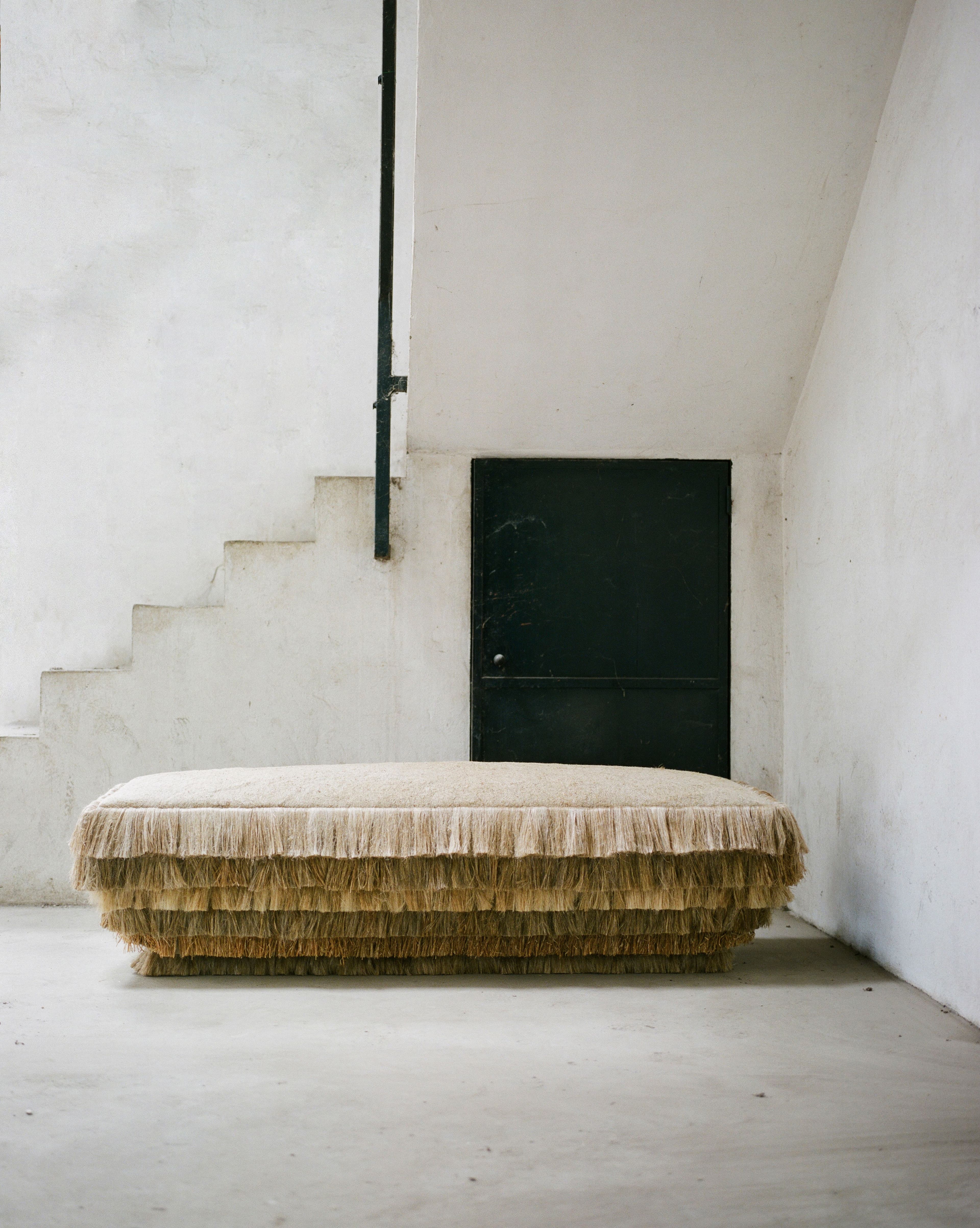 The fluffy bench is using the raw flax fiber. The piece is playing with the natural range of colors which depends on the soil, the weather, and the time of harvest of the flax.The flax presents a hairy, fluffy aspect which is usually unknown in its standard versions.