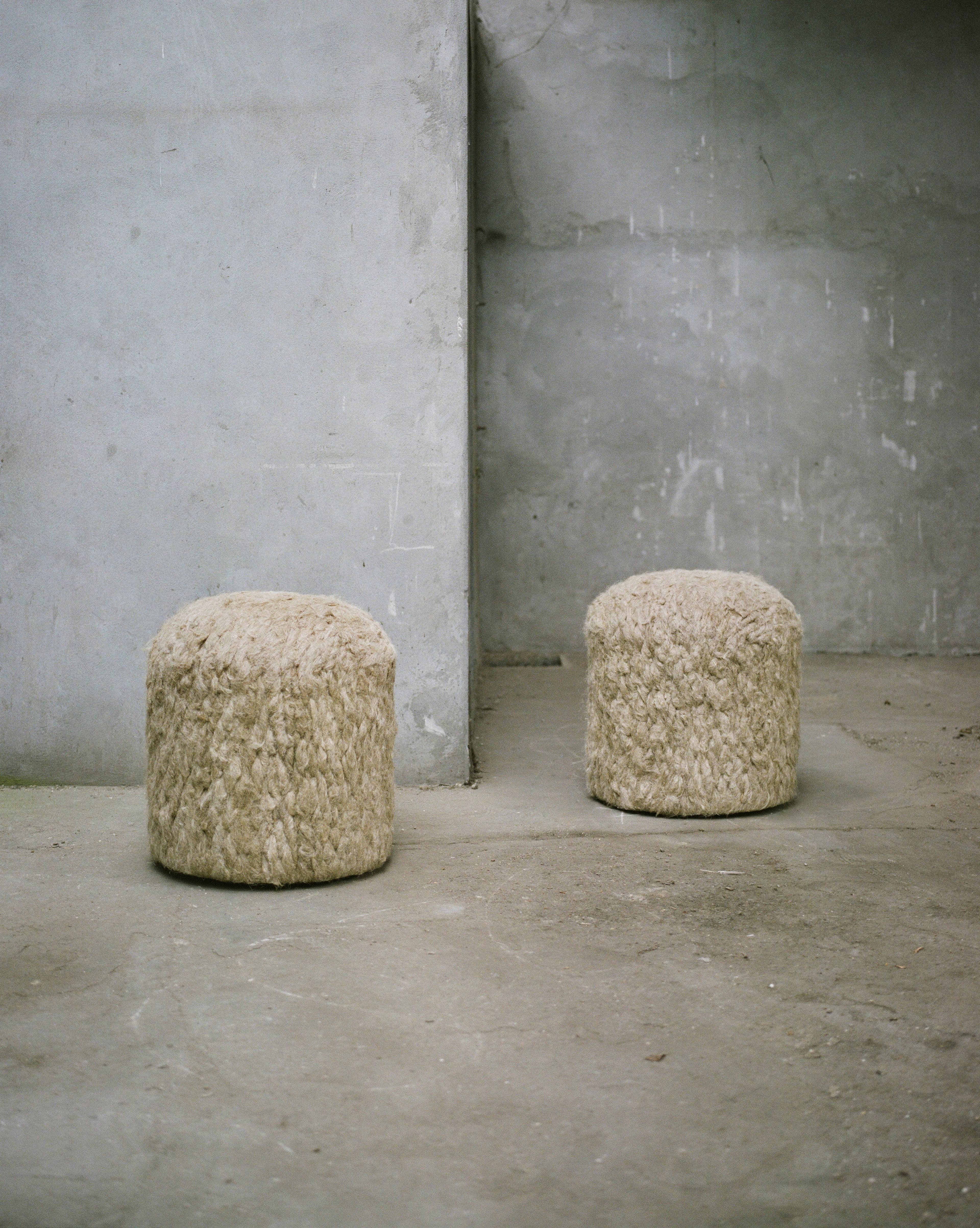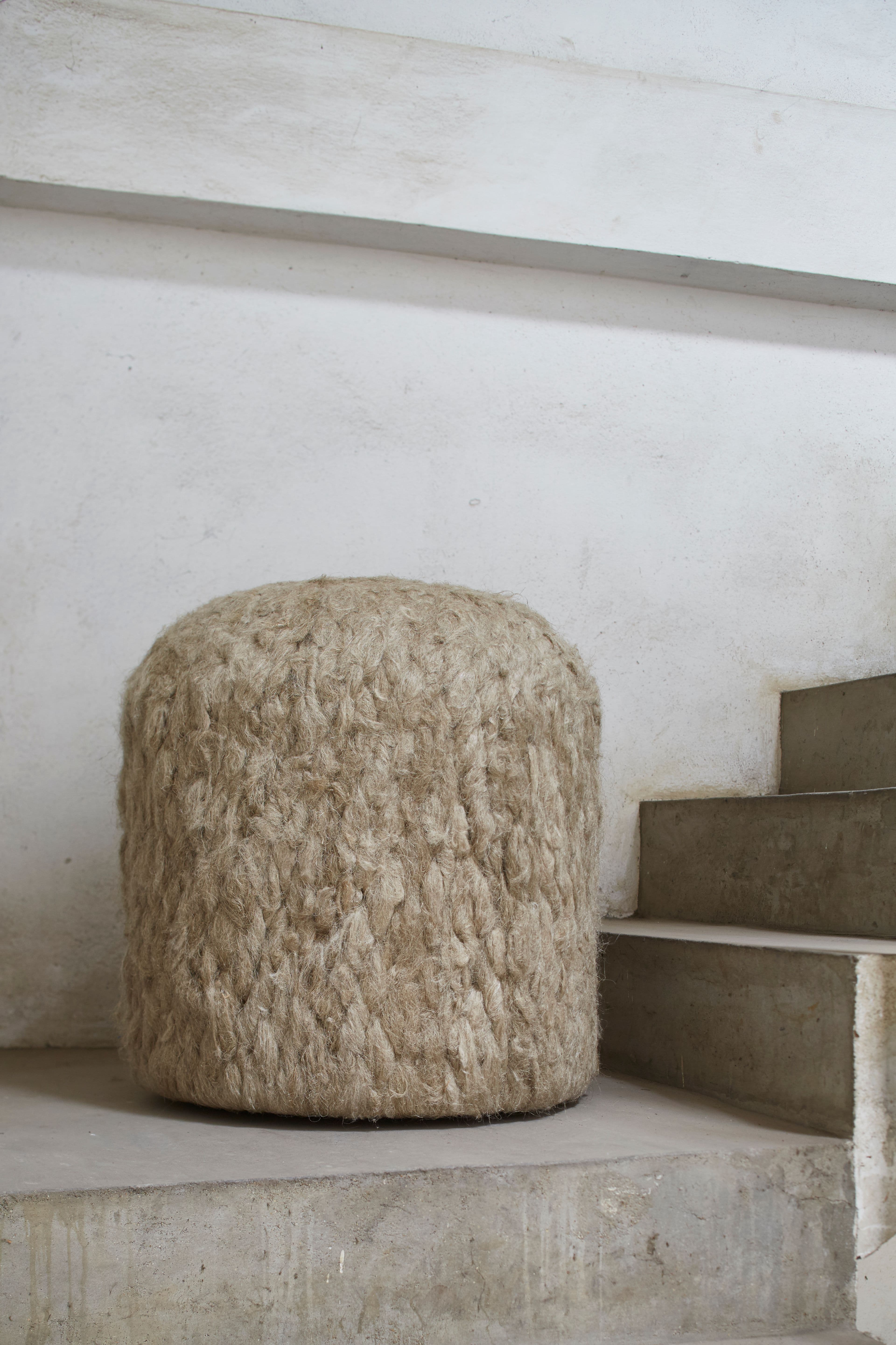 The piece is made by using the short fibers of linen, an agricultural under-product resulting from the combing of the fiber. In that sense, it is exclusively vegetal, 100% flax.The short fibers are used as a stuffing material inside with traditional upholstery technic (springs and ropes) and also used on the outside, to play with this expressive, animal-like, wooly quality of the material.