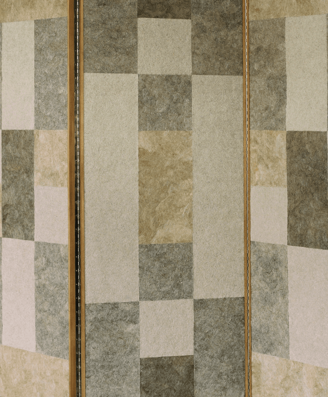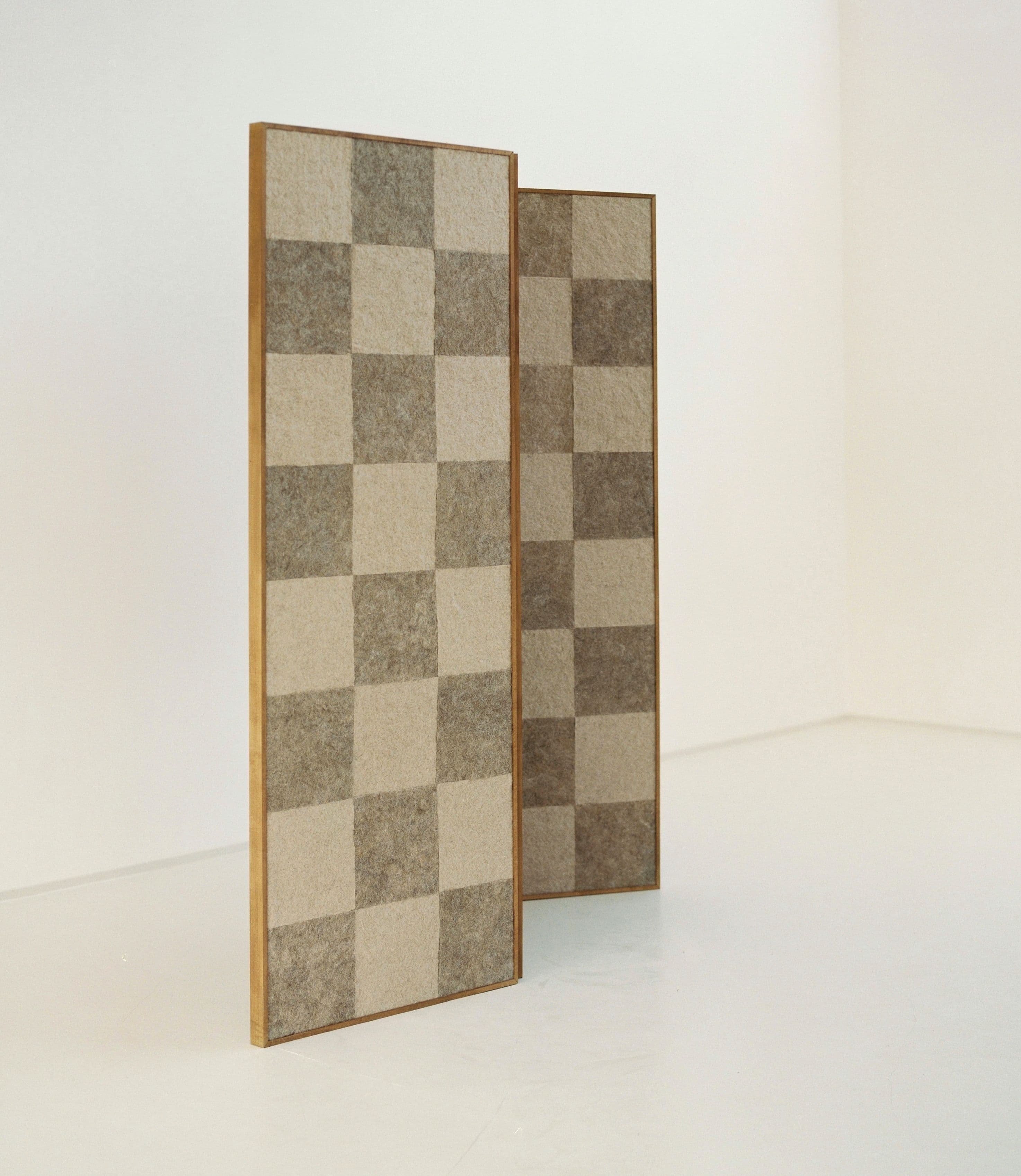 The room divider is using the raw flax fiber. The piece is playing with the natural range of colors which depends on the soil, the weather, and the time of harvest of the flax.The flax is felted, increasing the acoustic properties of the pieces and giving a warm feeling.