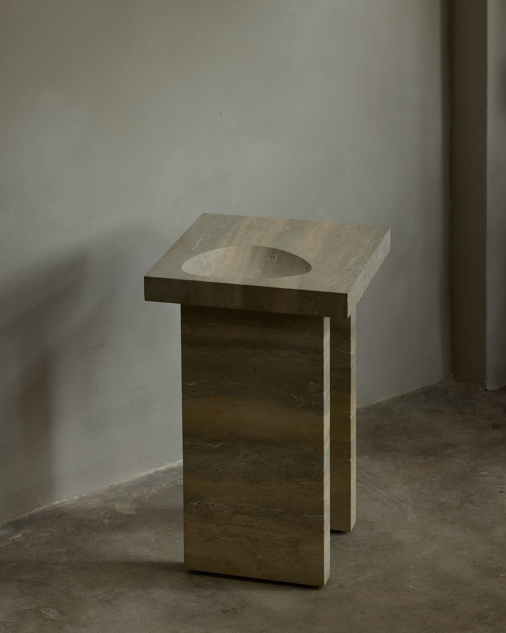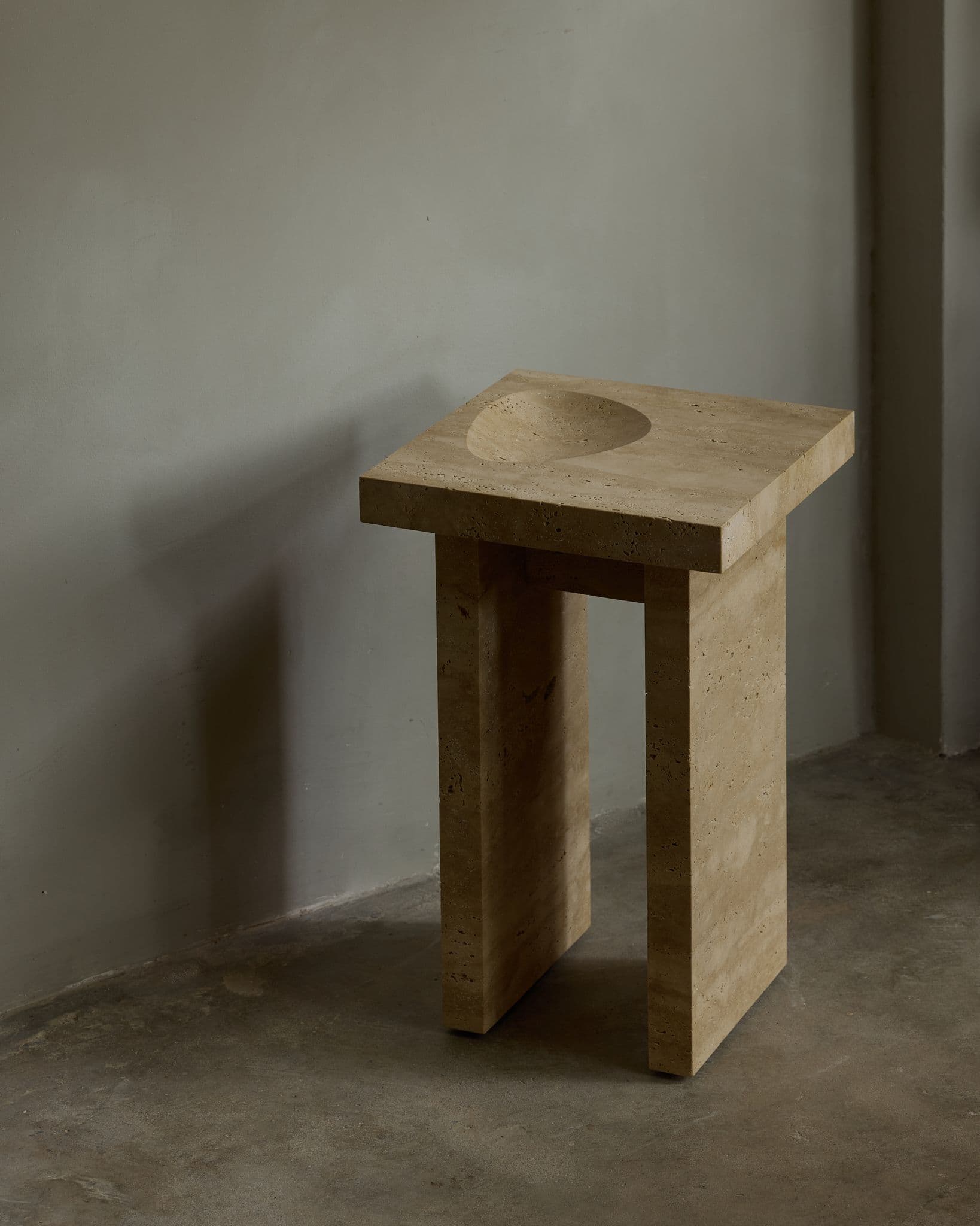 Tom Fereday presents “Mazer”, a series of geometric sculptures, each a celebration of the fundamental beauty and natural variation of stone. Strict brutalist forms of the table and seating collection are juxtaposed by soft organic cutaways carving through the porous stone surfaces, revealing the natural beauty and character of travertine.