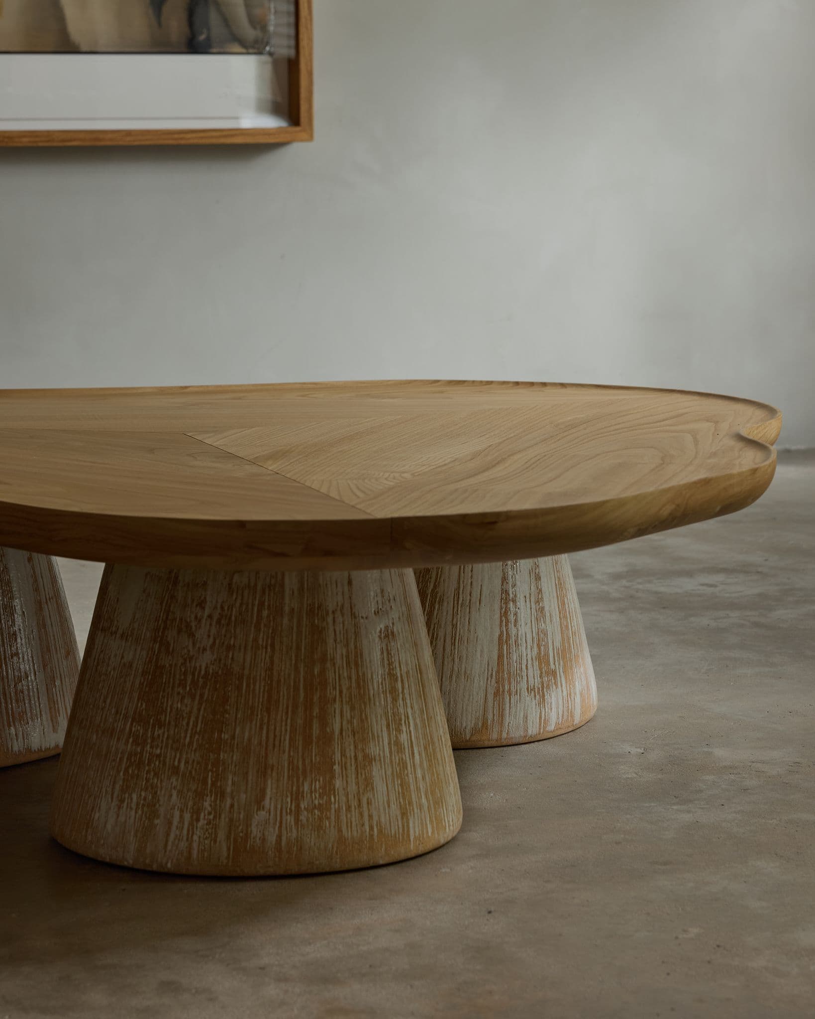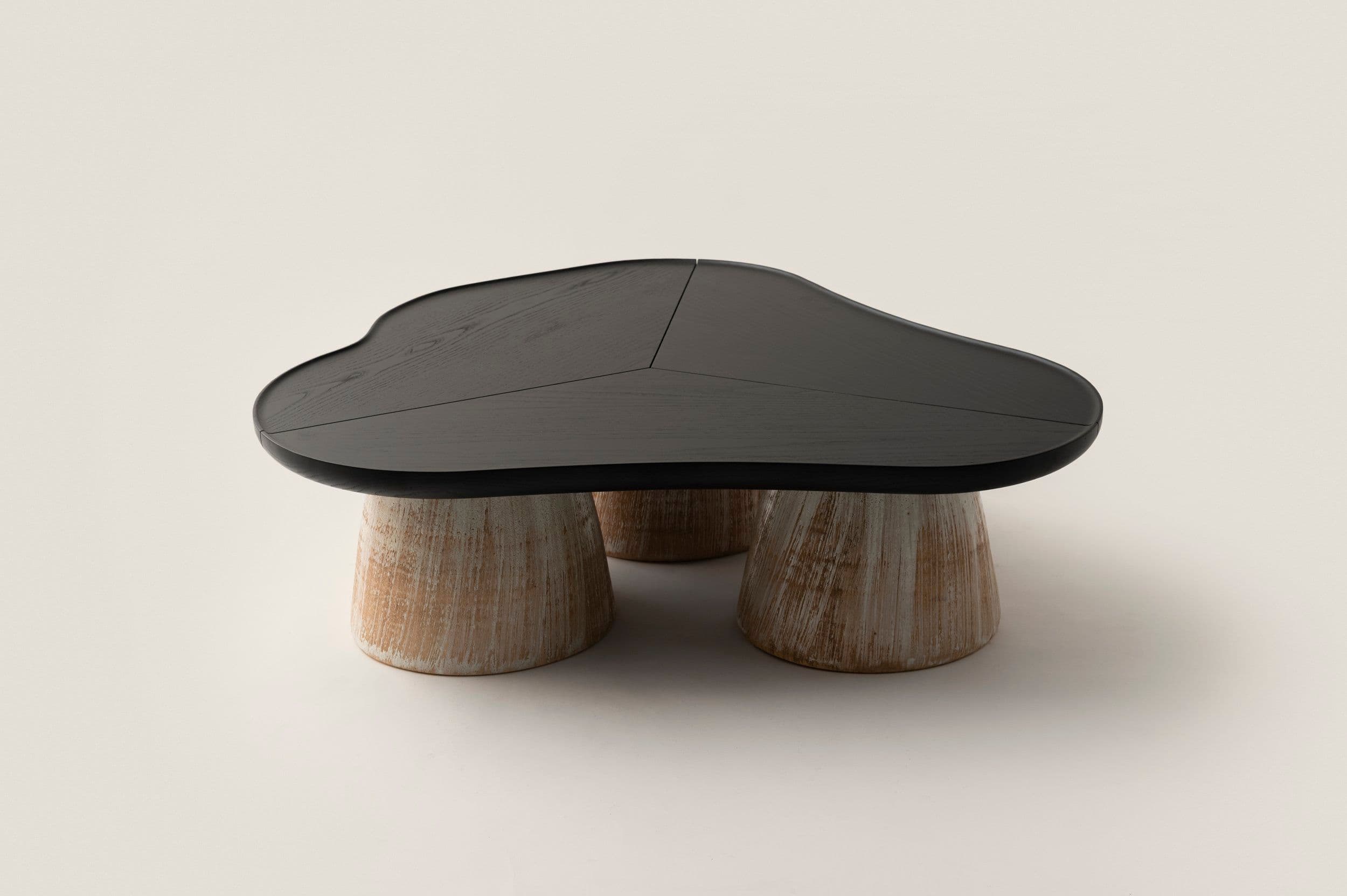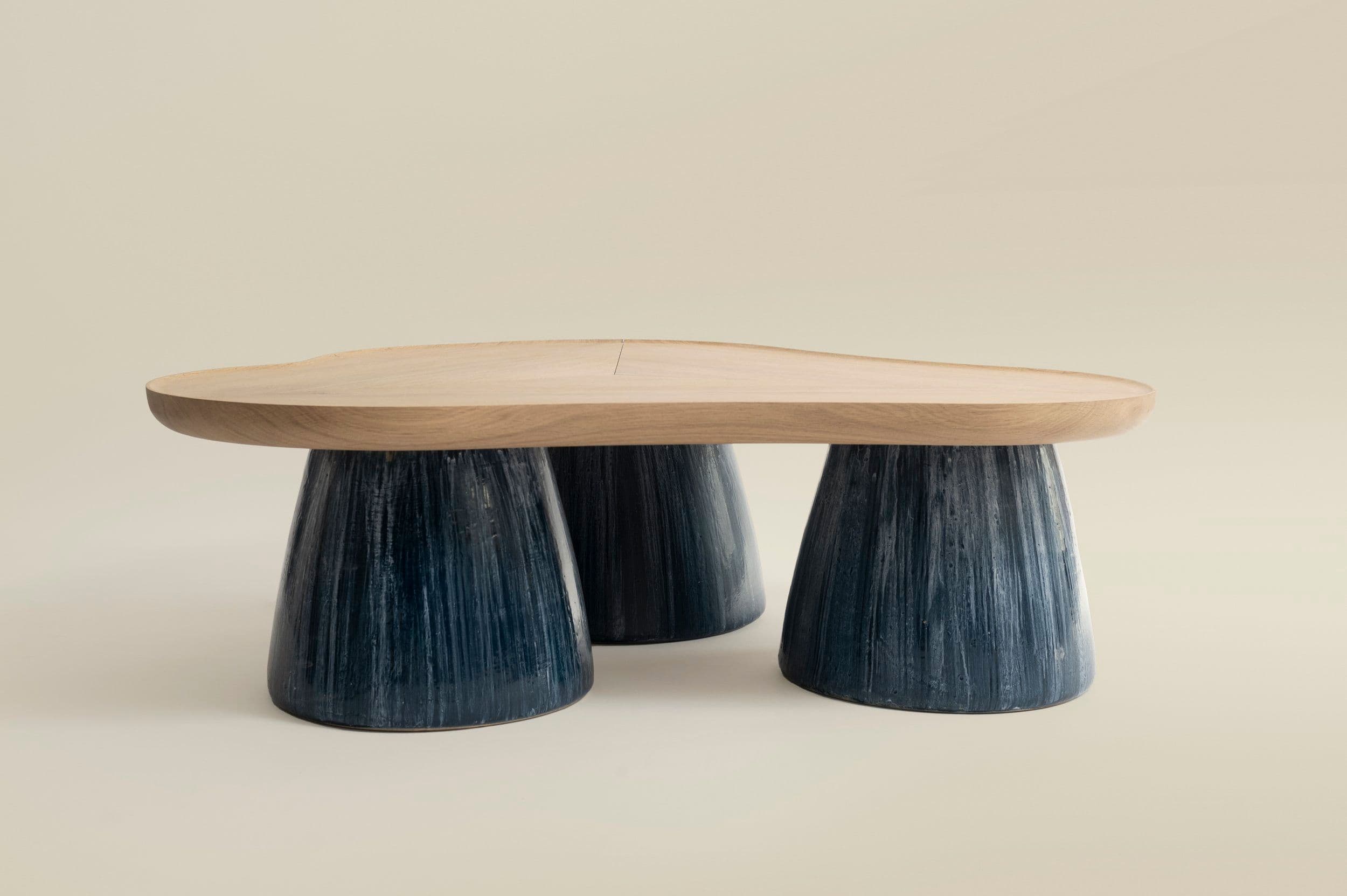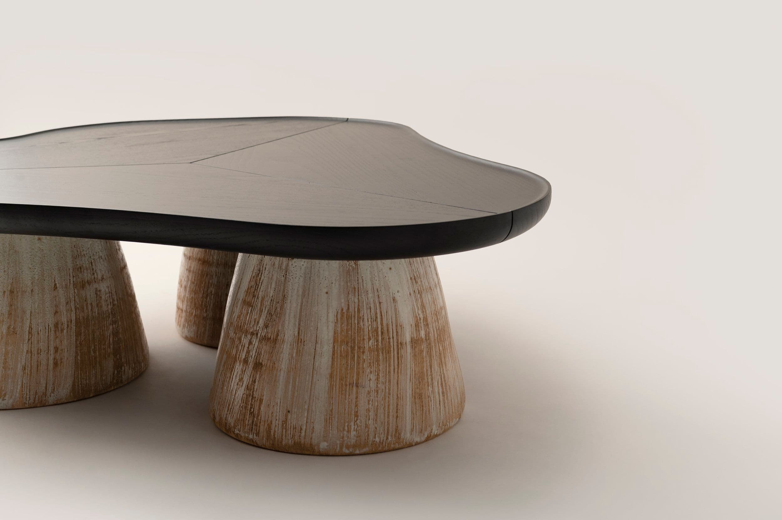 Designed by Garcé & Dimofski, Mimi is a coffee table all in roundness, made with a chestnut top supported by a triptych of glazed ceramic legs.