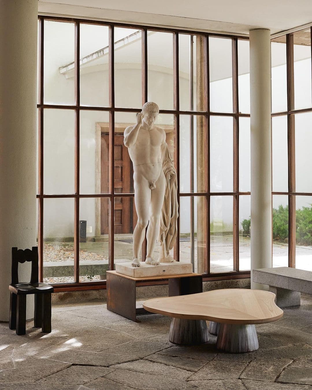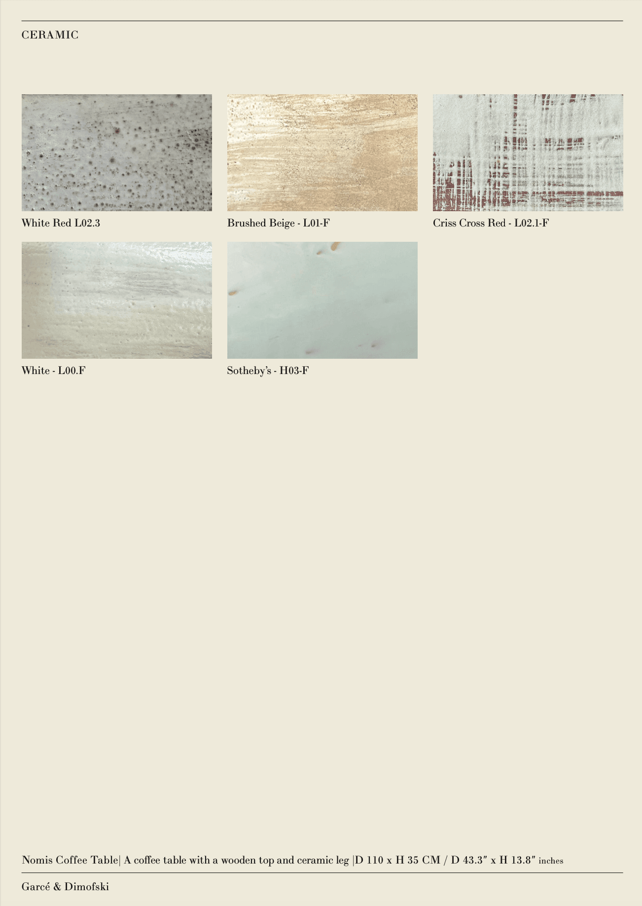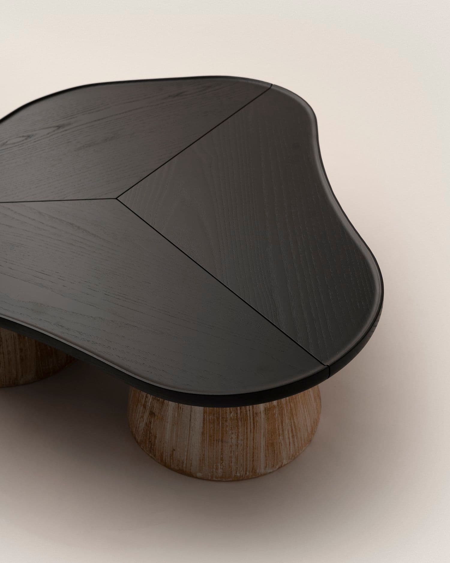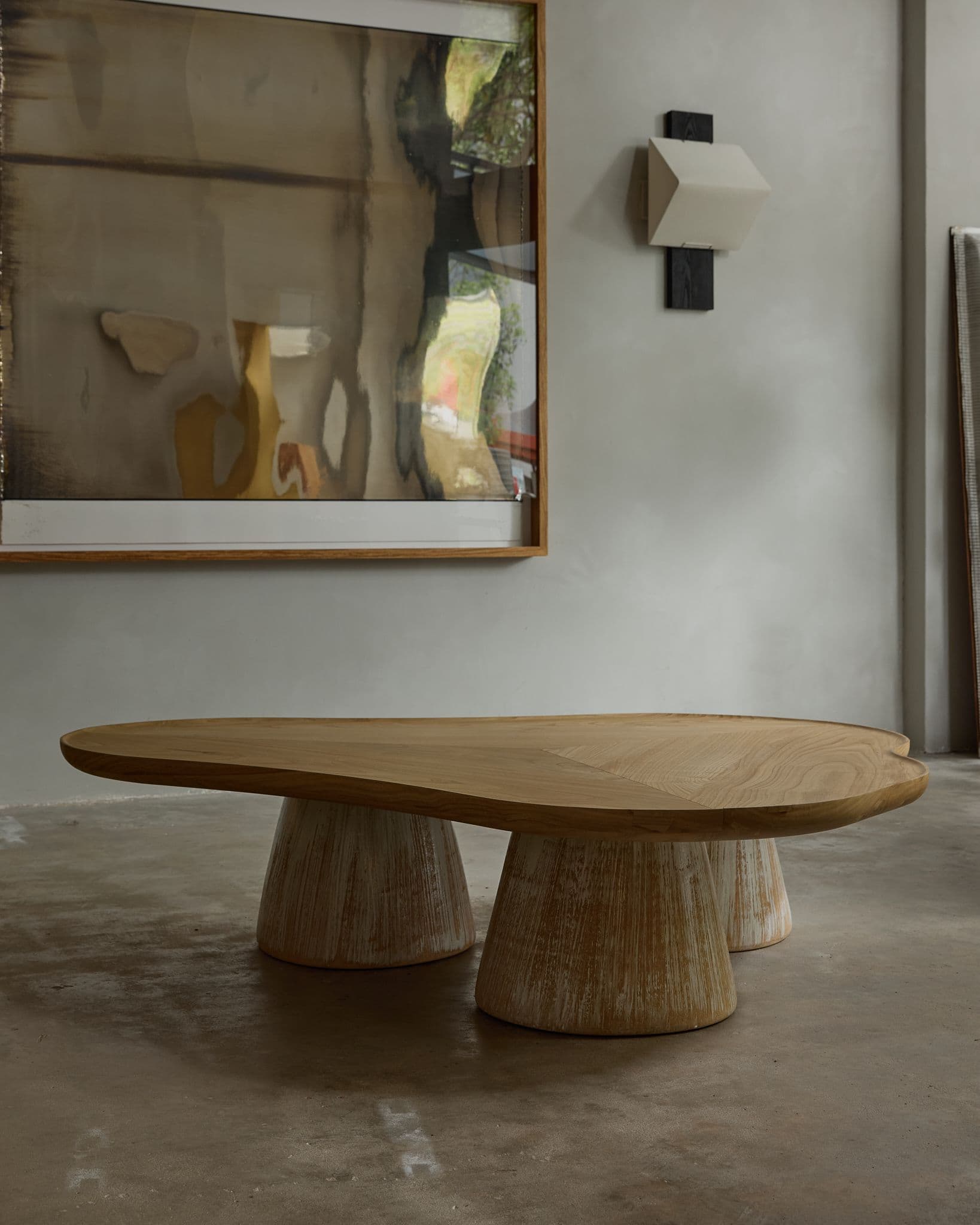 Designed by Garcé & Dimofski, Mimi is a coffee table all in roundness, made with a chestnut top supported by a triptych of glazed ceramic legs.