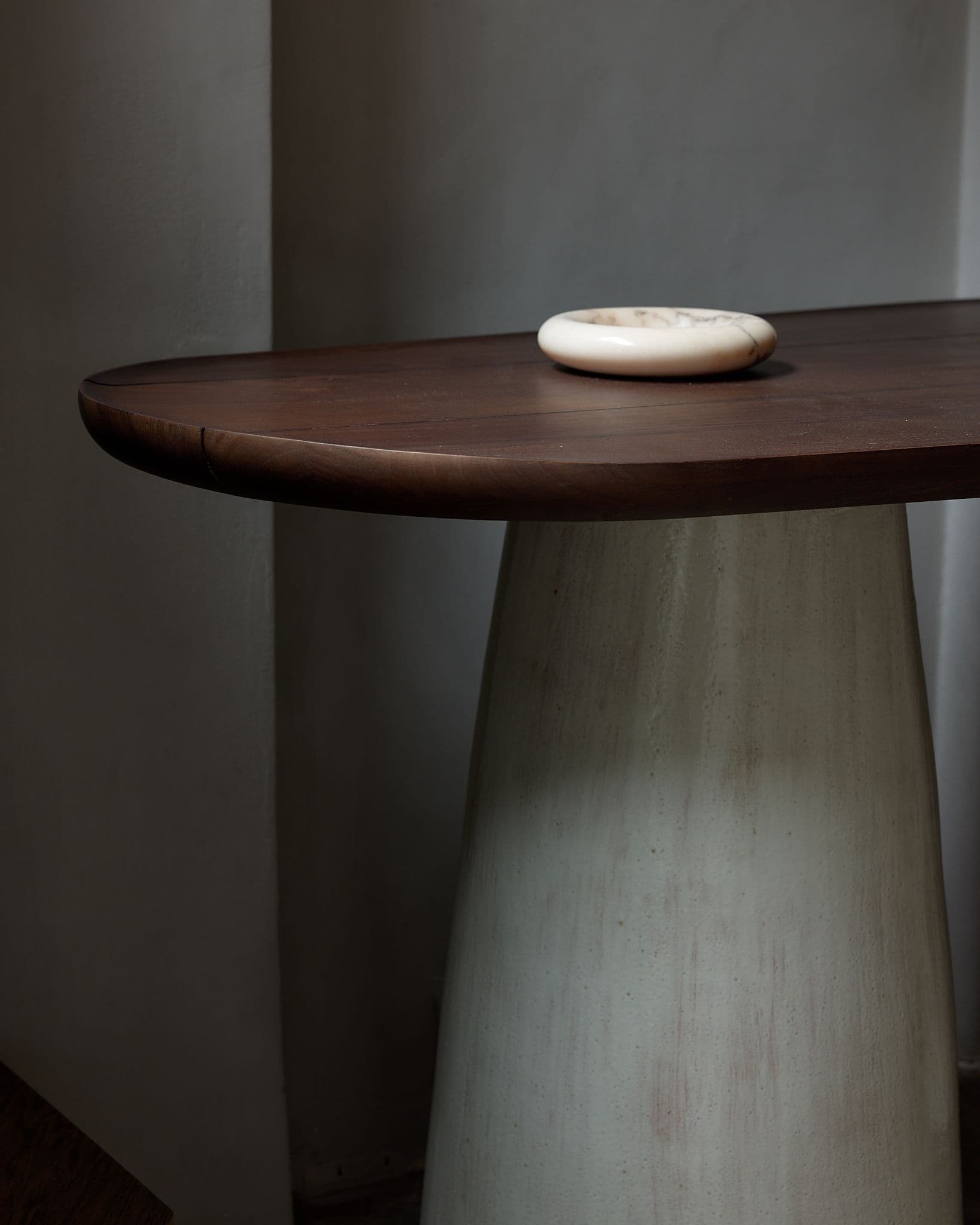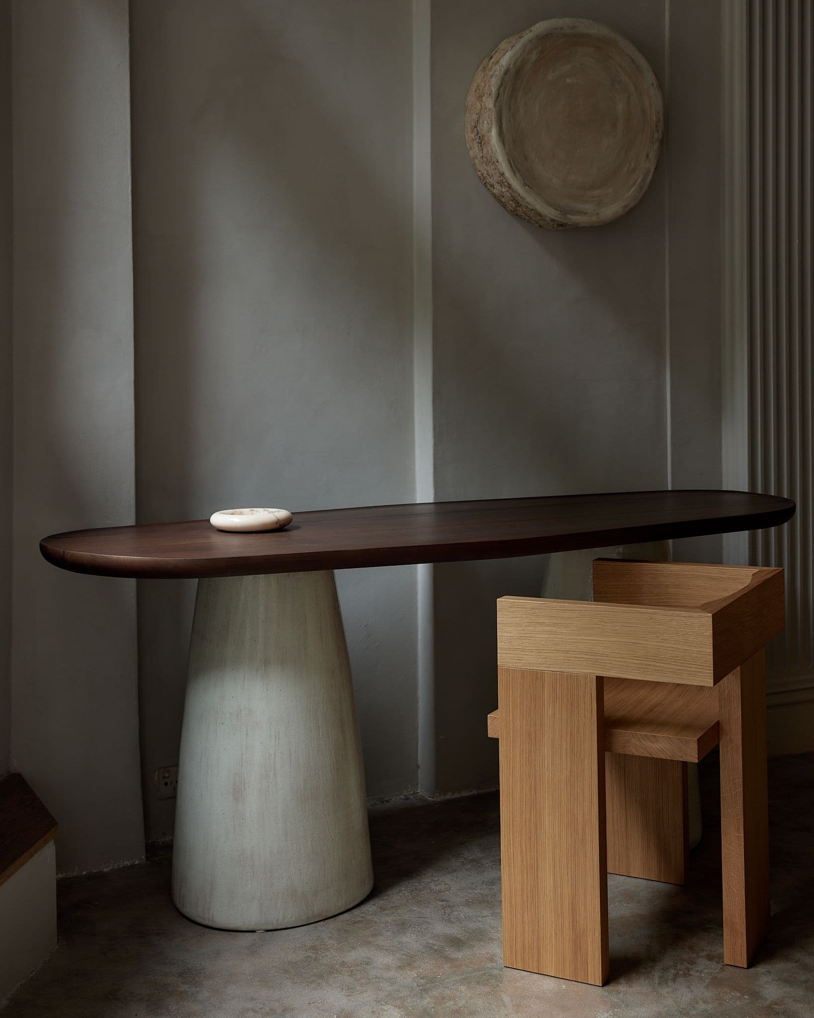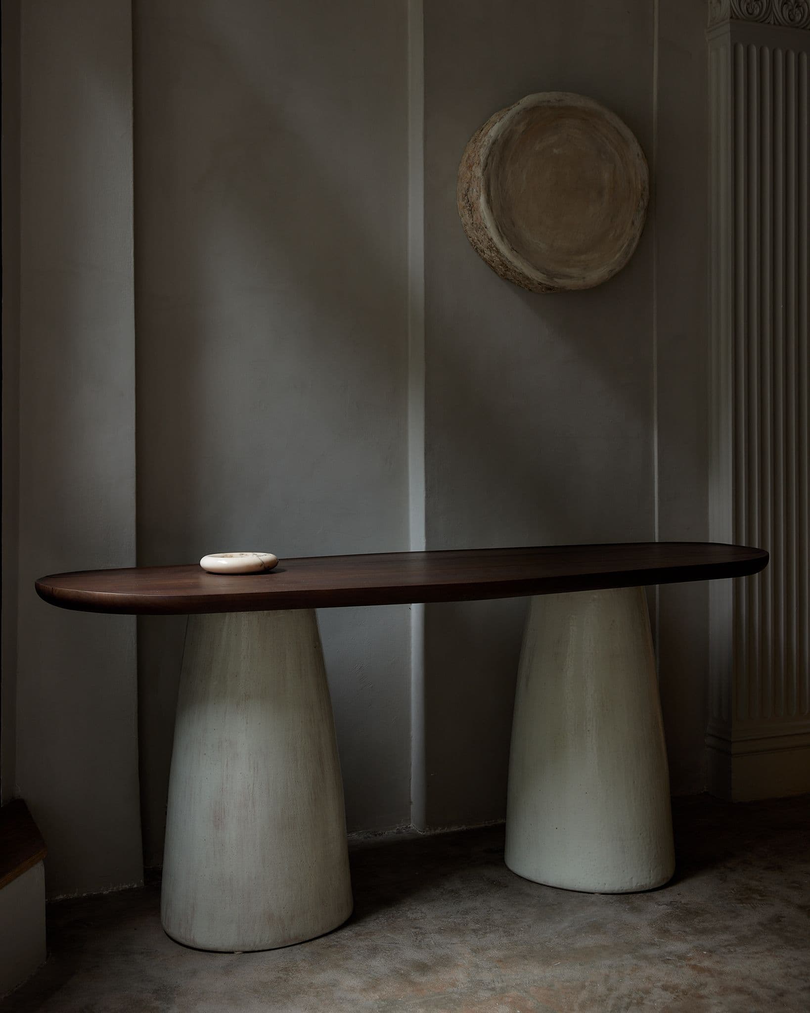 The Mimi Desk by Garcé & Dimofski is visually powerful, its purity evoking a streamlined aesthetic that seam- lessly integrates into any interior. Its strong materiality underscores the craftsmanship quality and durability of the object, adding a tangible dimension to its charm. A wooden edging adds a touch of discreet sophistication. This subtle decorative element emphasizes a commitment to understated elegance, highlighting the intrinsic beauty of the material and design.