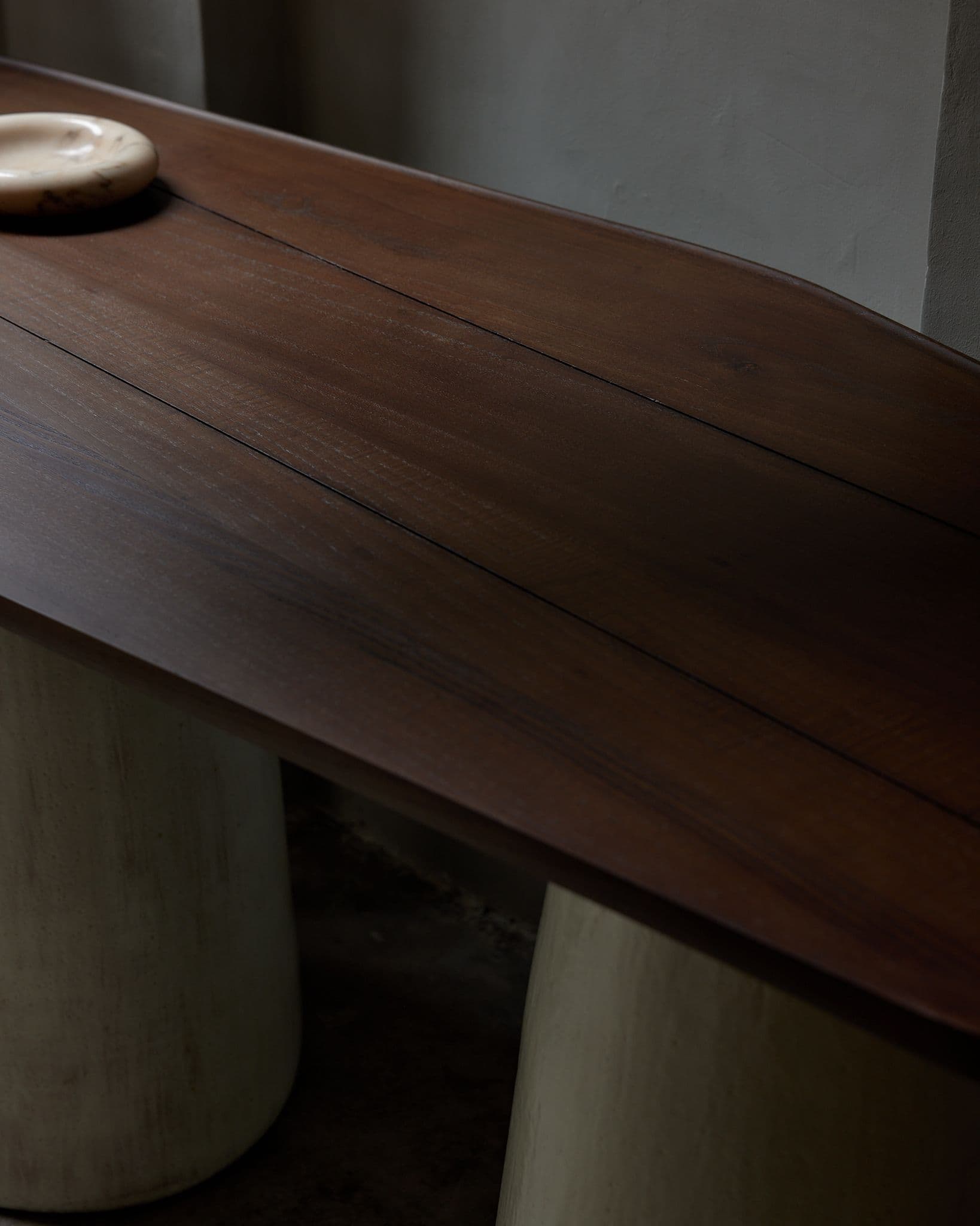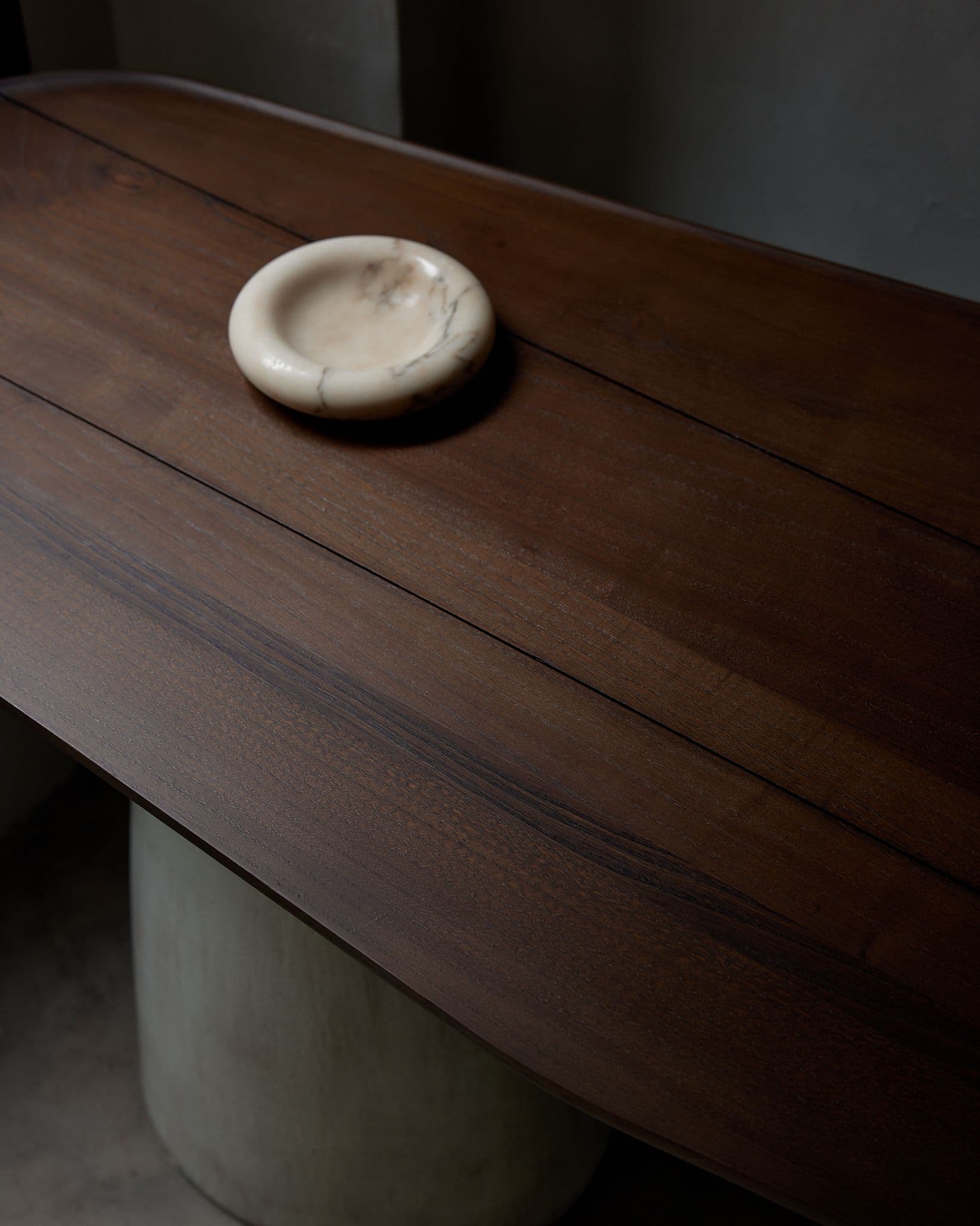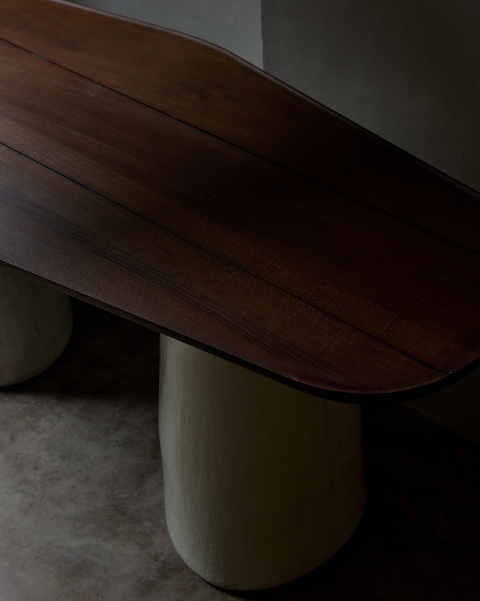 The Mimi Desk by Garcé & Dimofski is visually powerful, its purity evoking a streamlined aesthetic that seam- lessly integrates into any interior. Its strong materiality underscores the craftsmanship quality and durability of the object, adding a tangible dimension to its charm. A wooden edging adds a touch of discreet sophistication. This subtle decorative element emphasizes a commitment to understated elegance, highlighting the intrinsic beauty of the material and design.