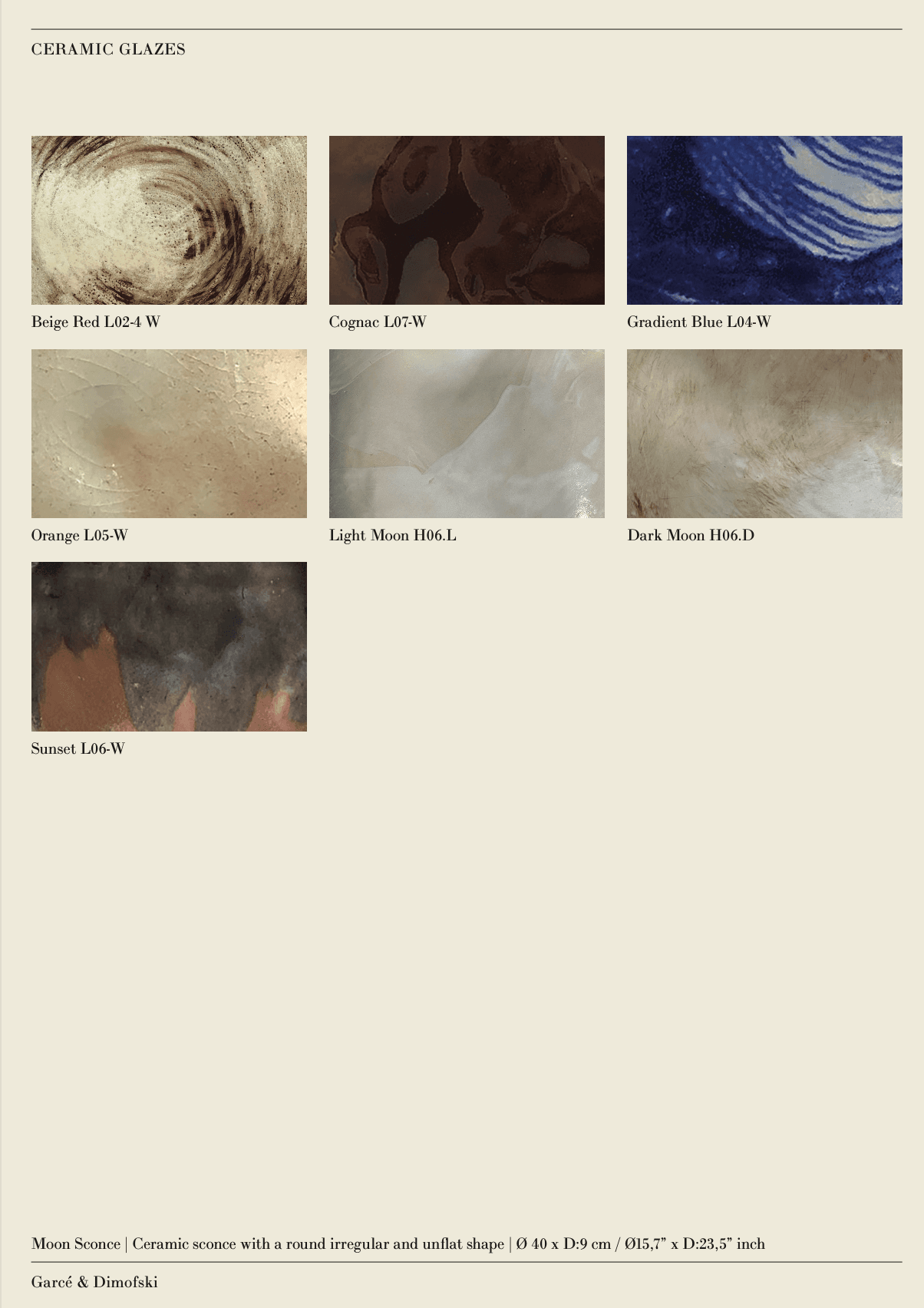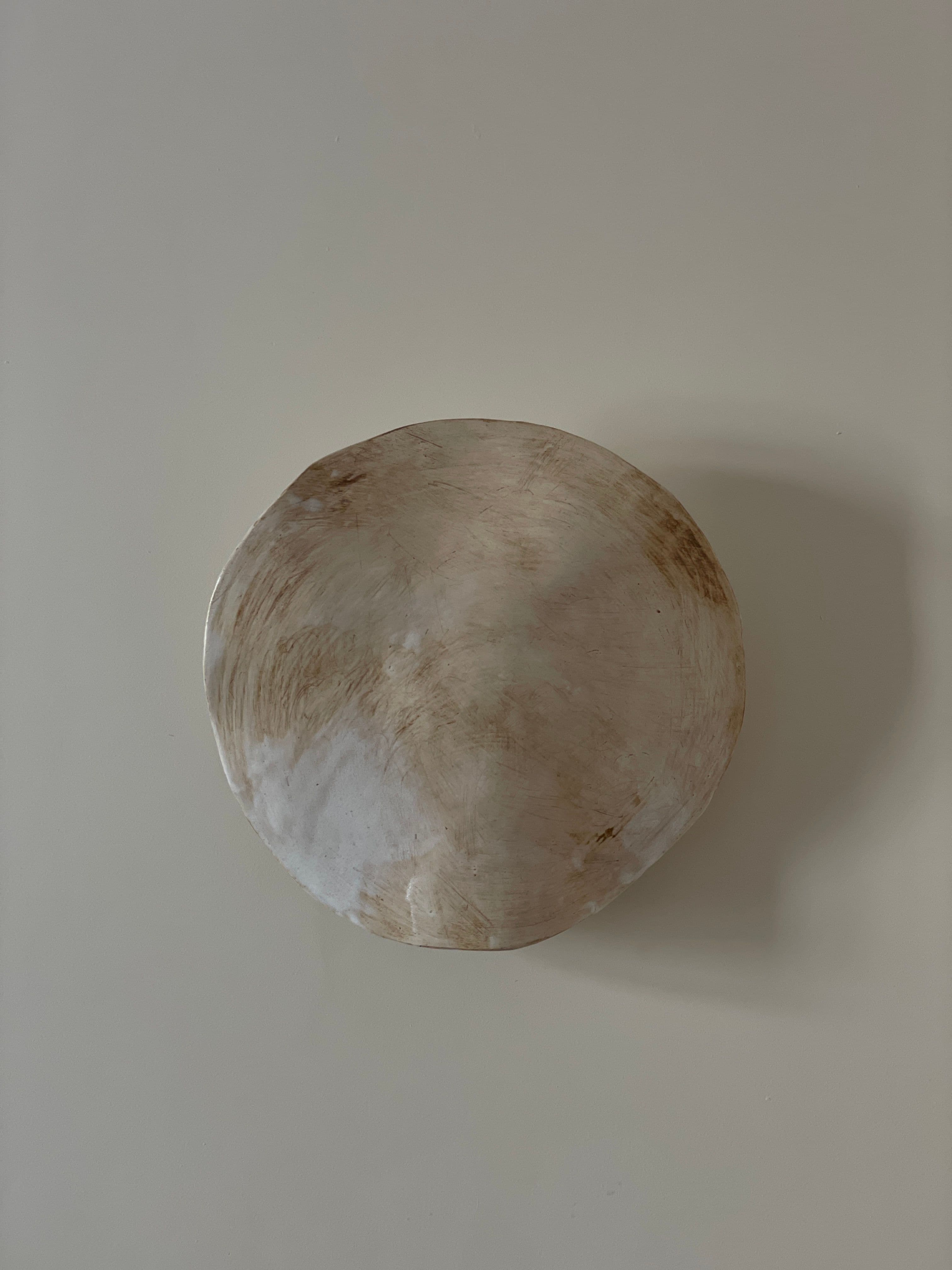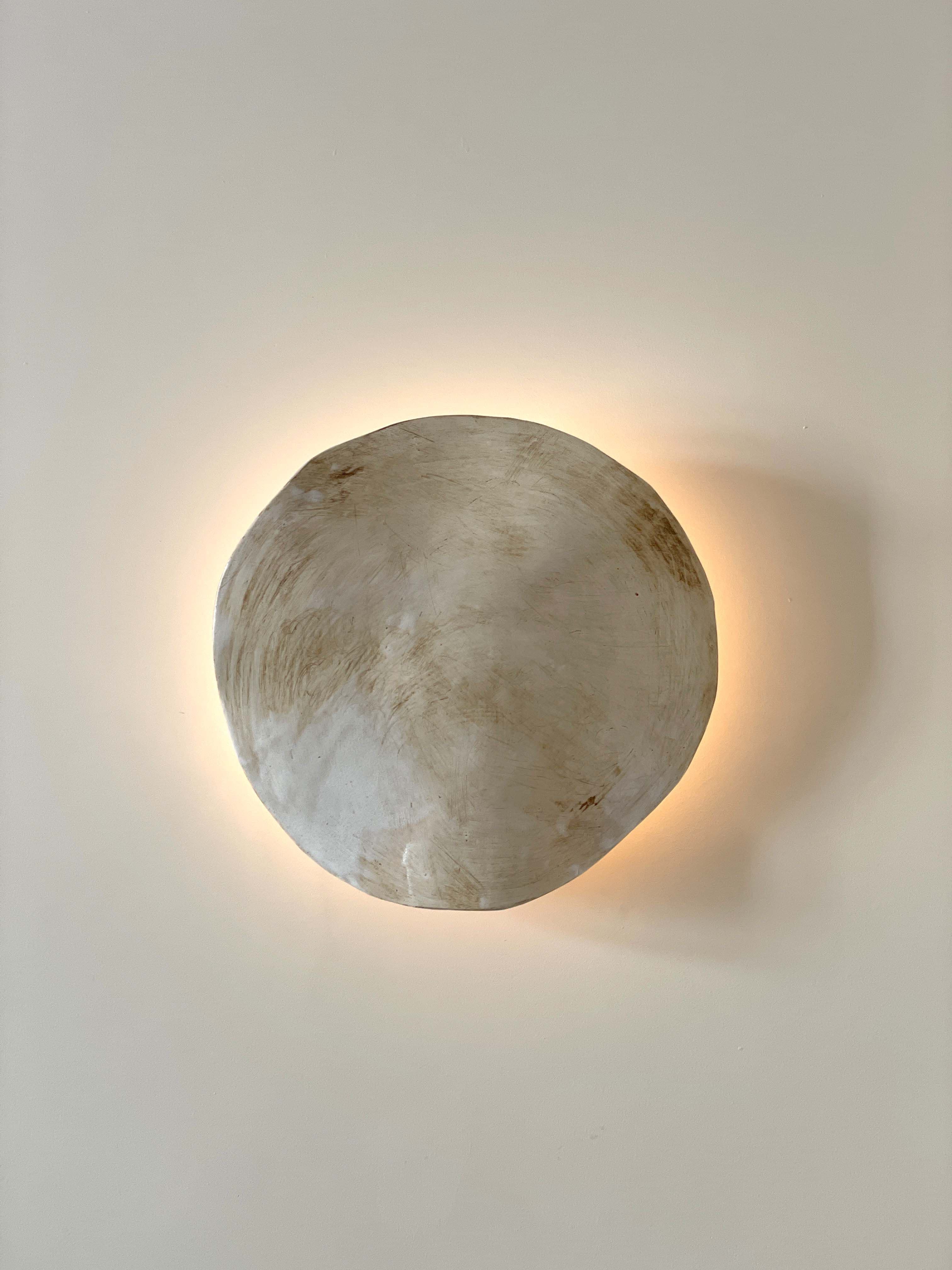 Ceramic sconce with a round irregular and unflat shape. Each sconce is unique due to its handmade nature, shapes and shades vary slightly.
