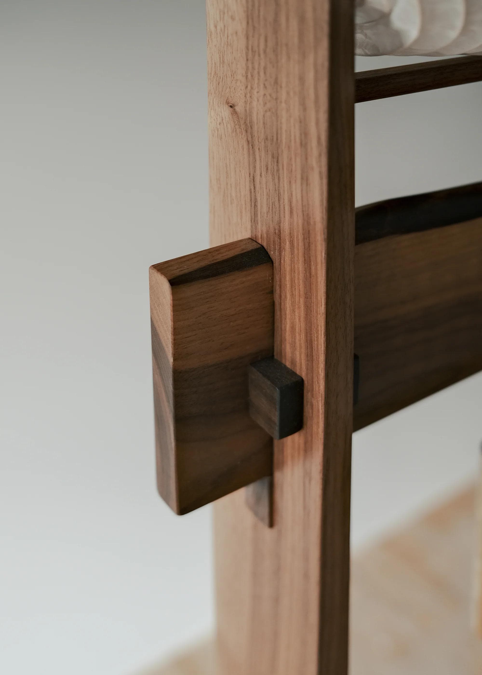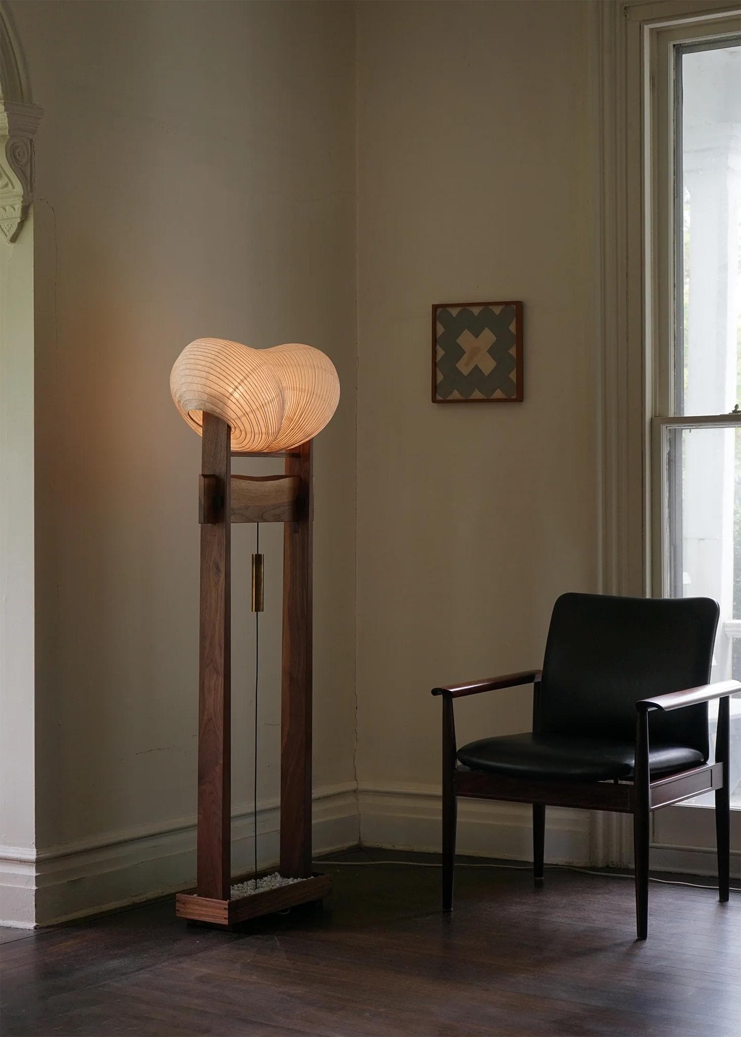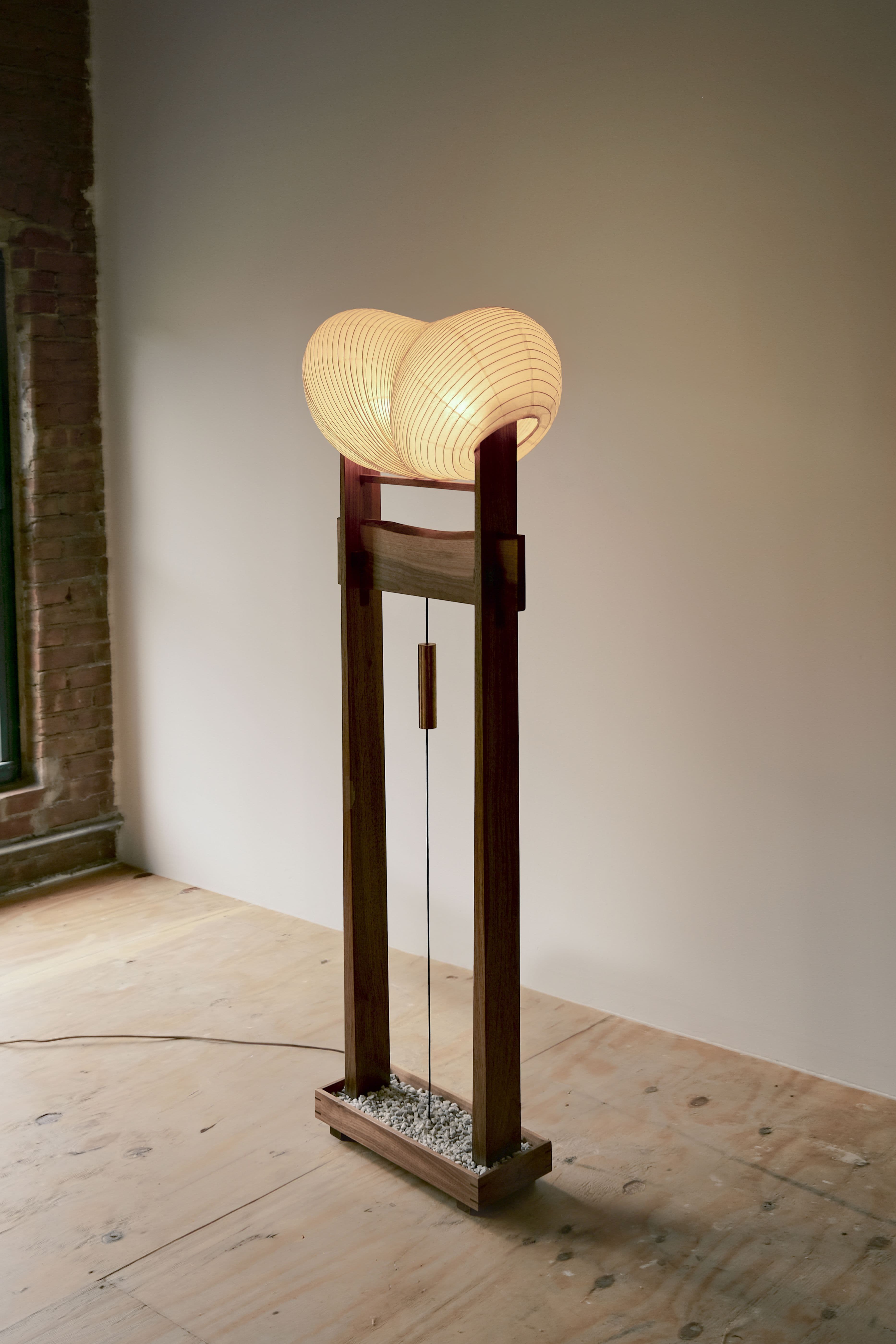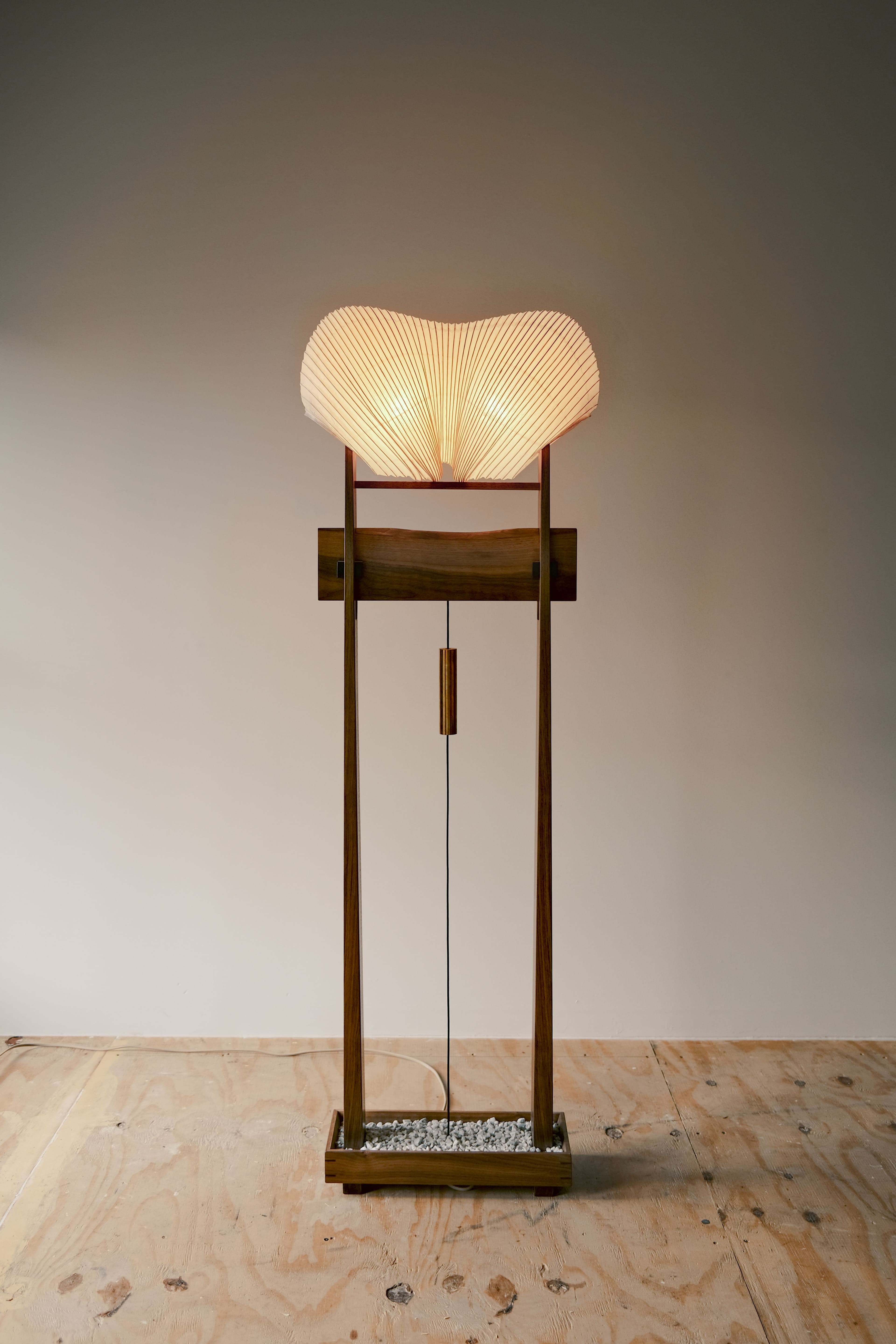 Made with American walnut, kozo paper, and rattan. Each piece comes with a unique live edge slab at the center cross beam, sourced locally with our lumber supplier. Weighed down with a rock tray base, the floating brass wind chime is also a dimmable touch switch able to be adjusted to three brightness settings.