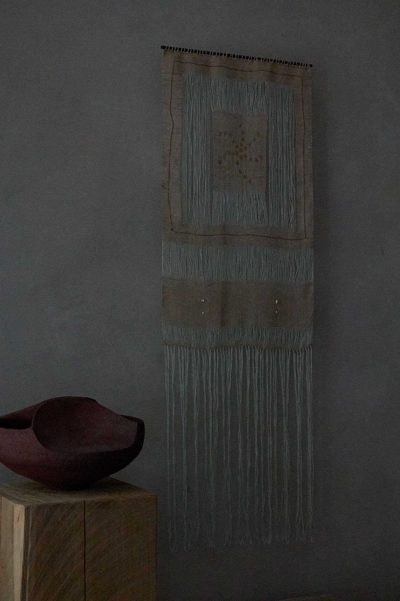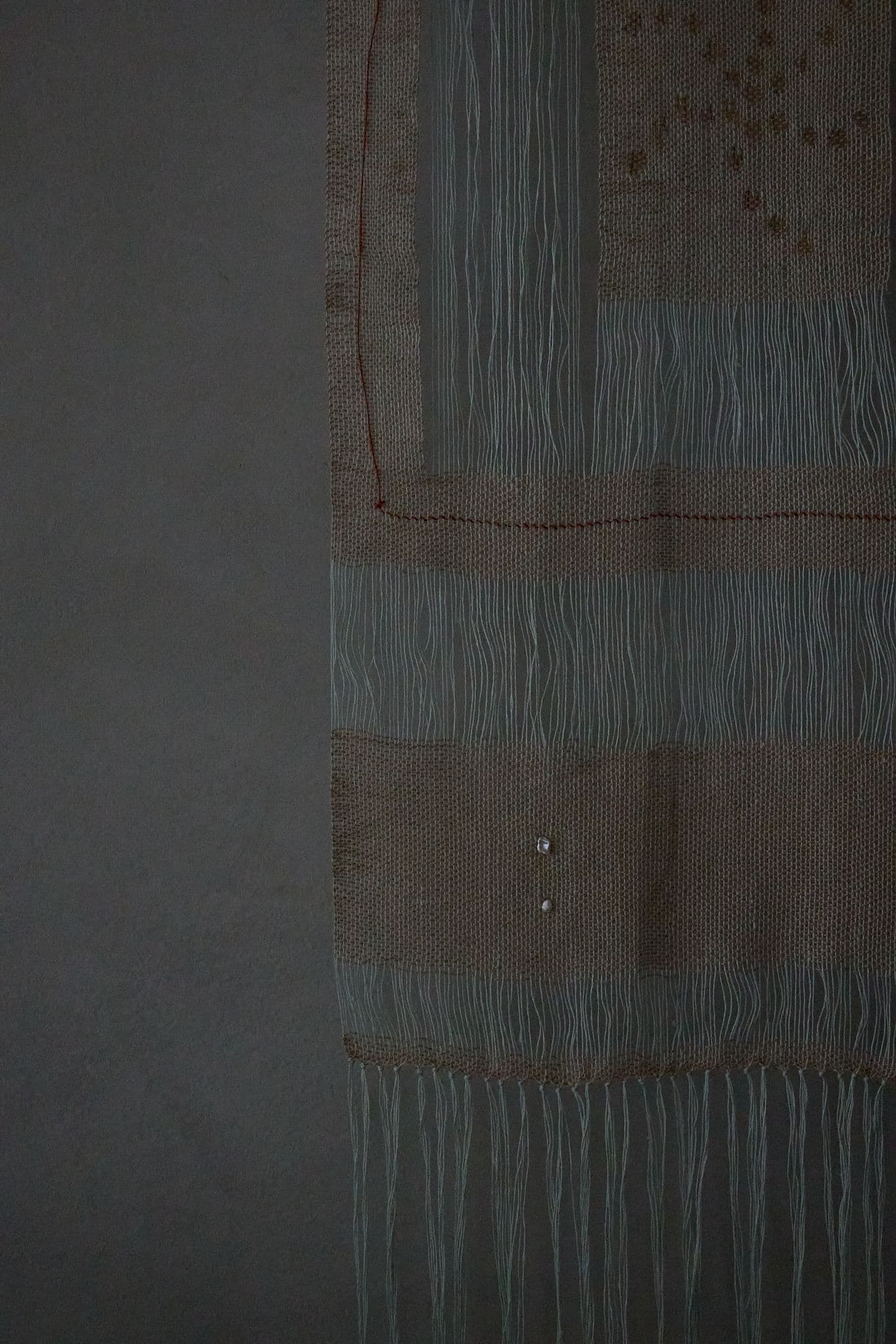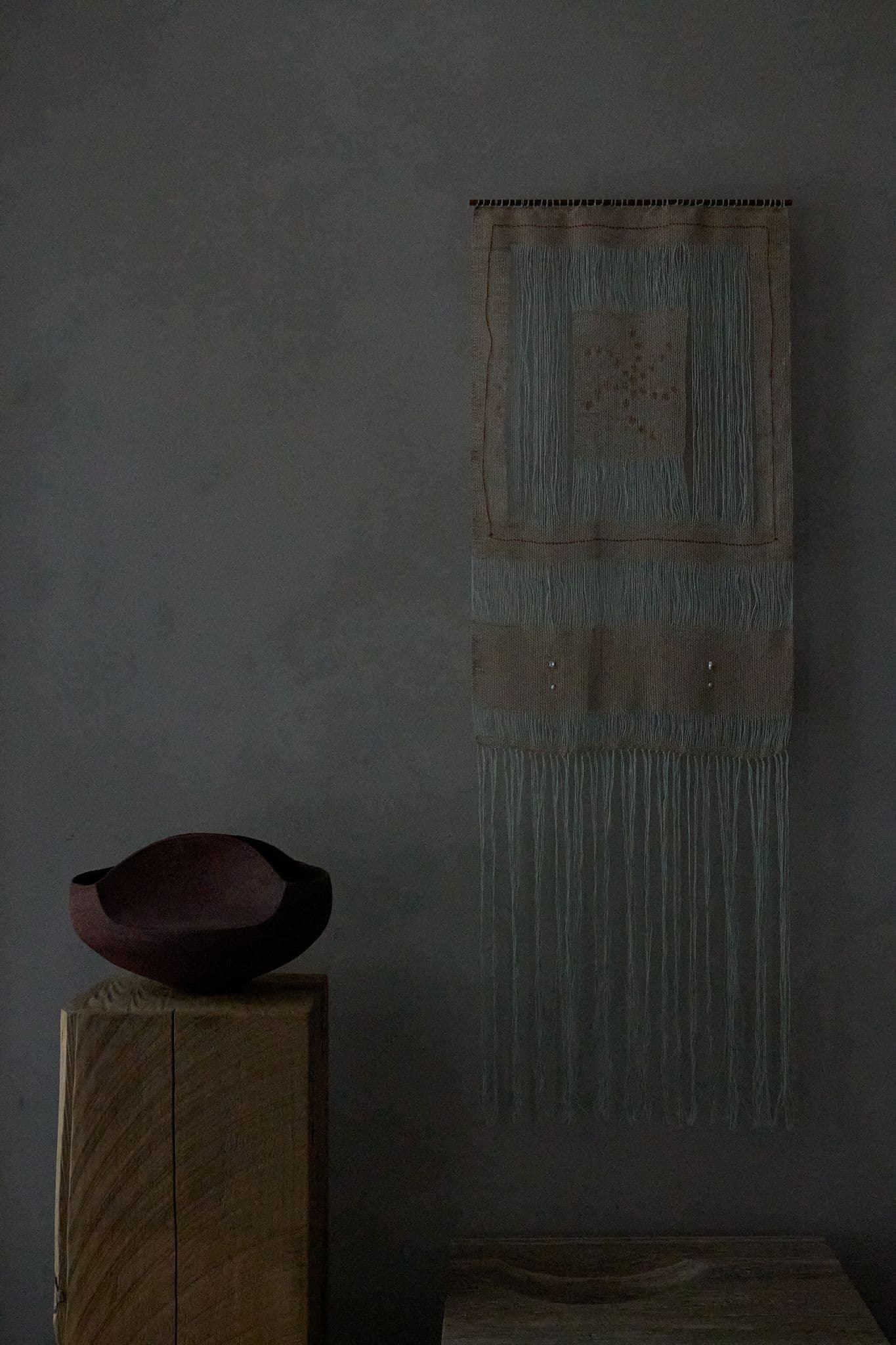 Through cotton, raffia, pearls, and paint, Wae layers material gestures that echo both fragility and resilience. Each element holds symbolic weight: raffia as fibre tied to land, pearls as offerings from the sea, cotton as grounding, and paint as mark and presence. Together, they form a surface where personal memory and ancestral story move fluidly, much like sunlight shifting across water.